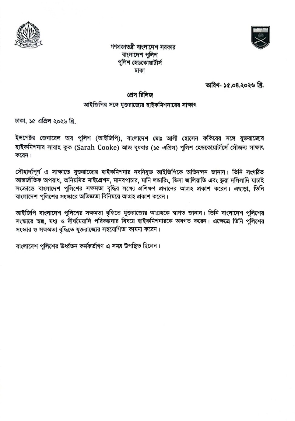 | 3 | Press Release on 15.04.26: আইজিপির সঙ্গে যুক্তরাজ্যের হাইকমিশনারের সাক্ষাৎ | 15-04-2026 | View |