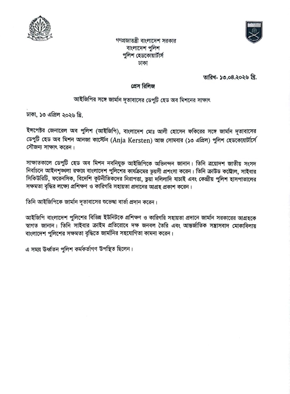 | 4 | Press Release on 13.04.26: আইজিপির সঙ্গে জার্মান দূতাবাসের ডেপুটি হেড অব মিশনের সাক্ষাৎ | 13-04-2026 | View |