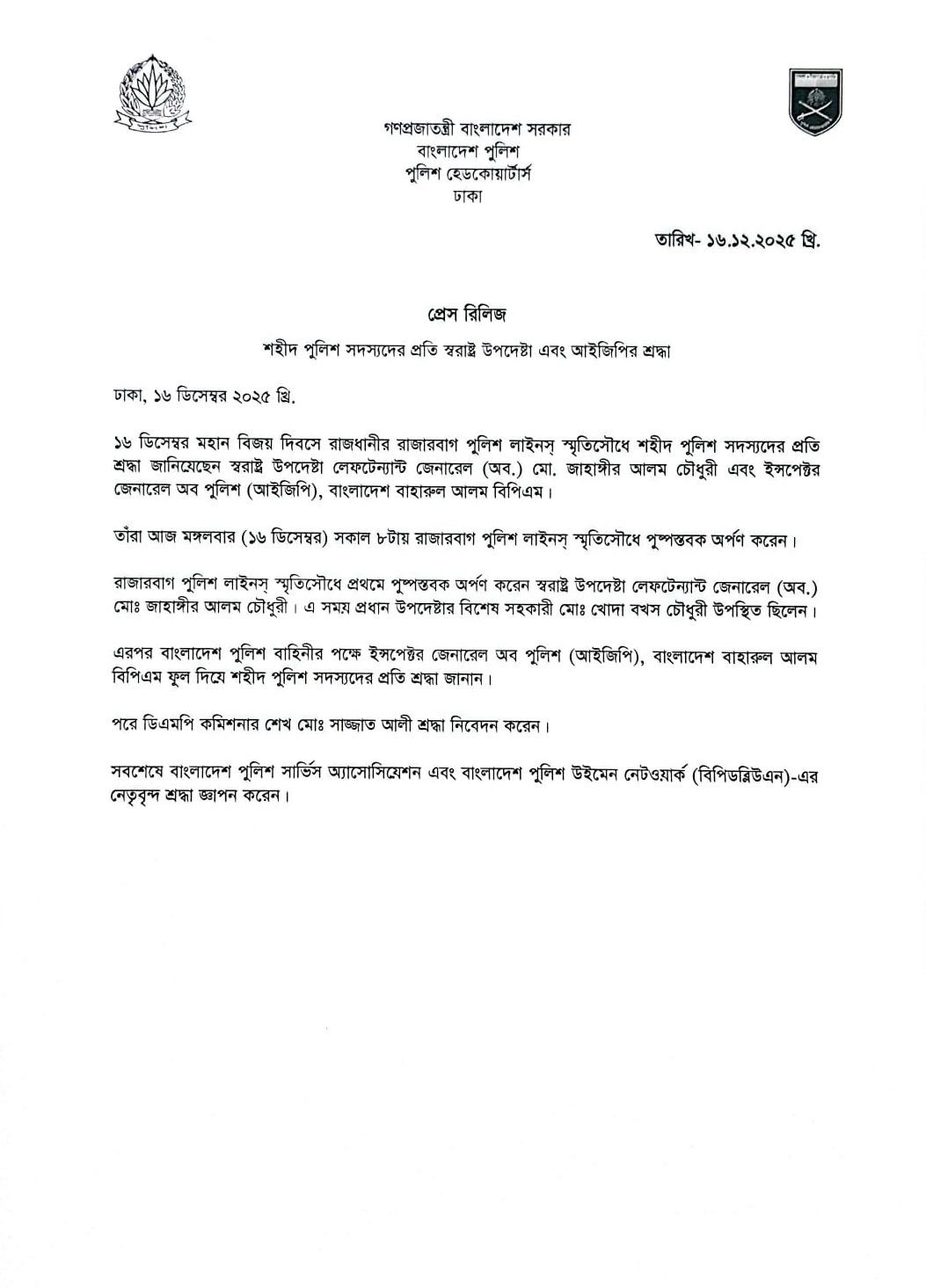 | 2 | Press Release on 16.12.25: শহীদ পুলিশ সদস্যদের প্রতি স্বরাষ্ট্র উপদেষ্টা এবং আইজিপির শ্রদ্ধা | 16-12-2025 | View |