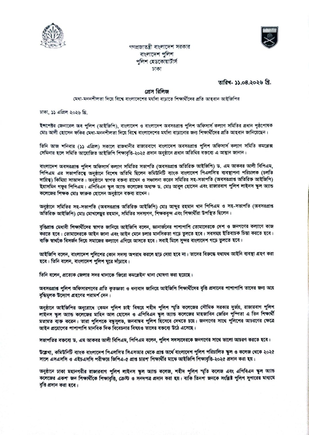 | 5 | Press Release on 11.04.26: মেধা-মননশীলতা দিয়ে বিশ্বে বাংলাদেশের মর্যাদা বাড়াতে শিক্ষার্থীদের প্রতি আহবান আইজিপির | 11-04-2026 | View |