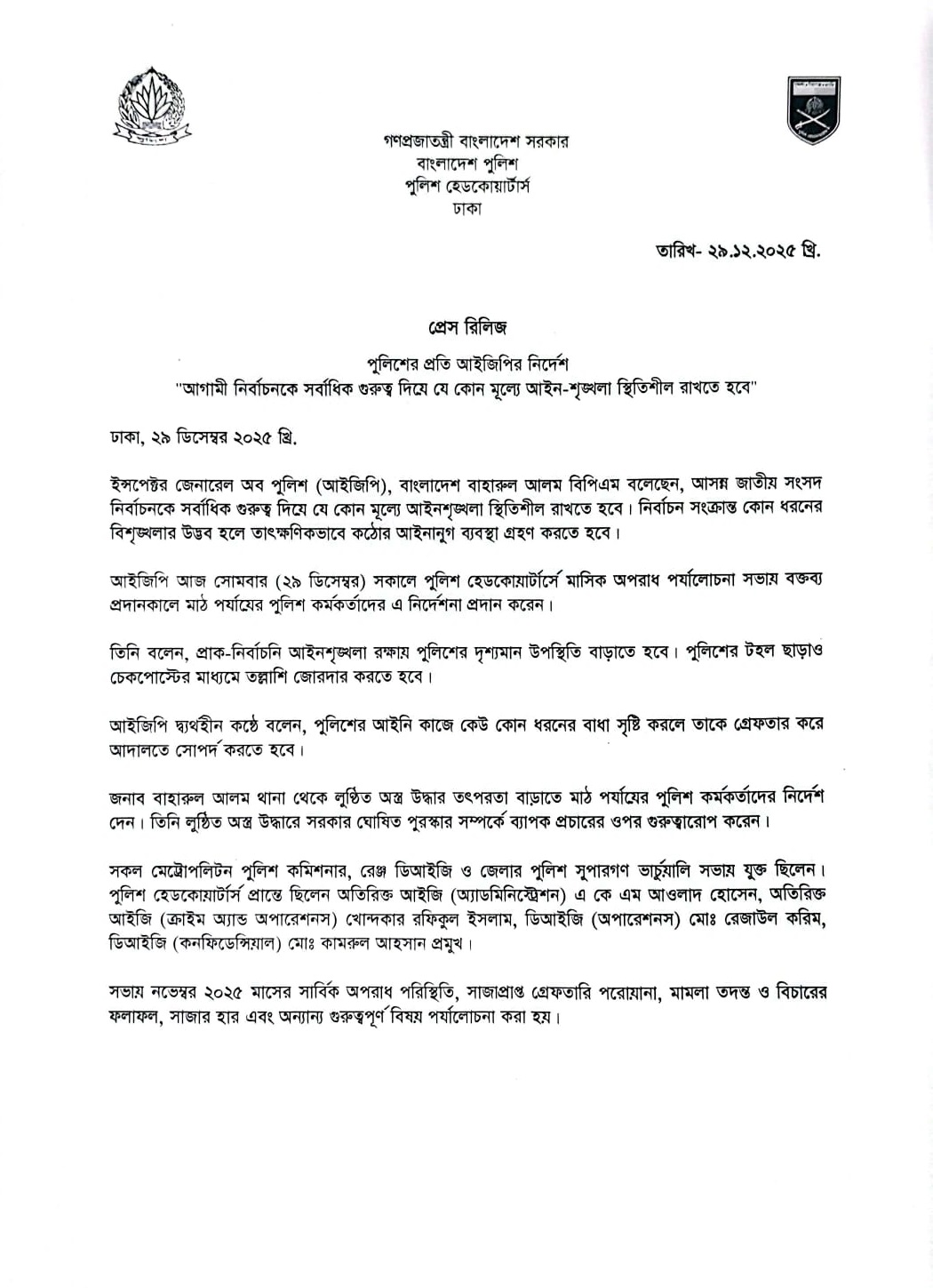 | 1 | Press Release on 29.12.25: পুলিশের প্রতি আইজিপির নির্দেশ "আগামী নির্বাচনকে সর্বাধিক গুরুত্ব দিয়ে যে কোন মূল্যে আইন-শৃঙ্খলা স্থিতিশীল রাখতে হবে" | 29-12-2025 | View |