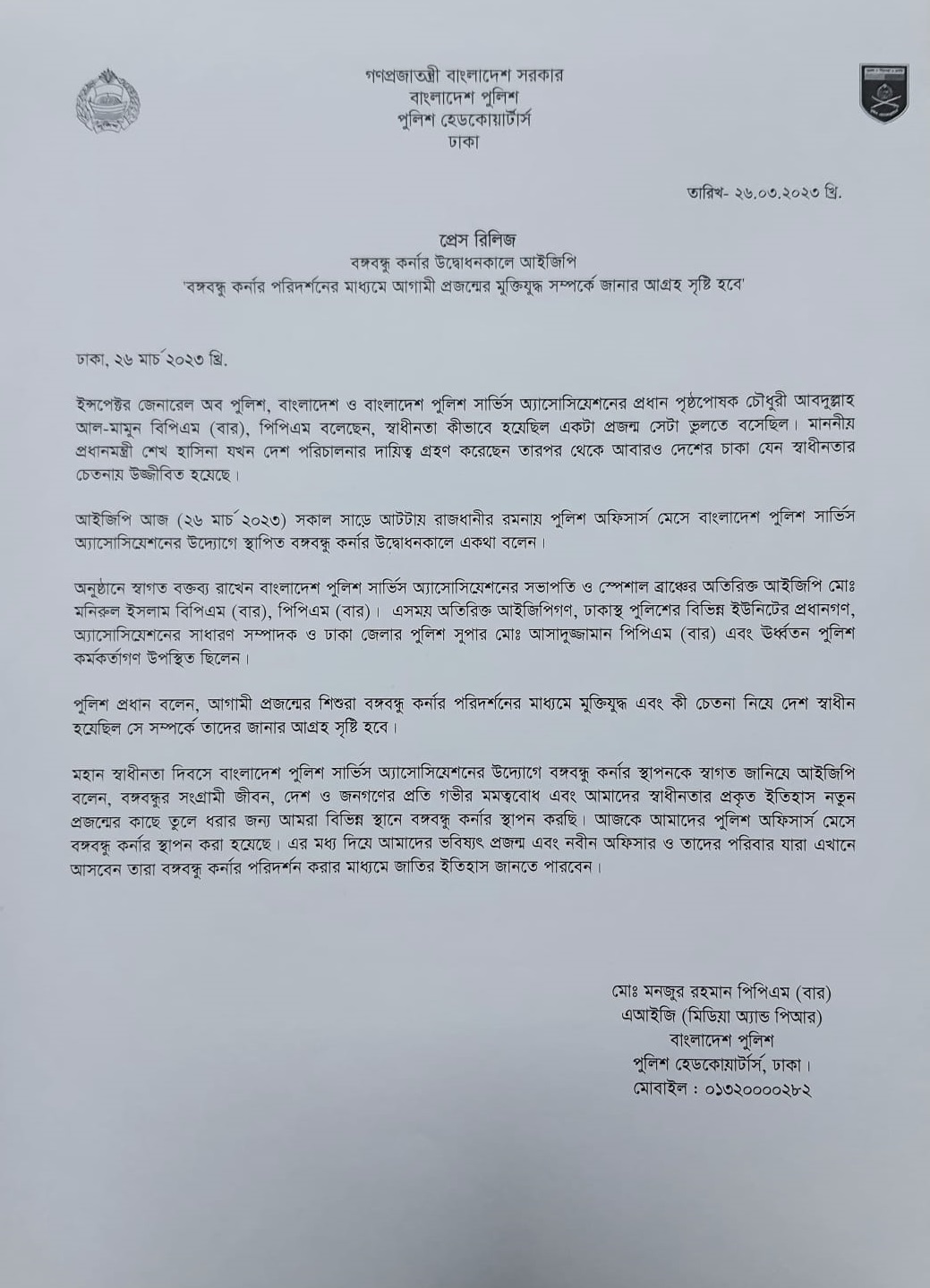 | 129 | Press Release on 26.03.2023: বঙ্গবন্ধু কর্নার উদ্বোধনকালে আইজিপি | 26-03-2023 | View |