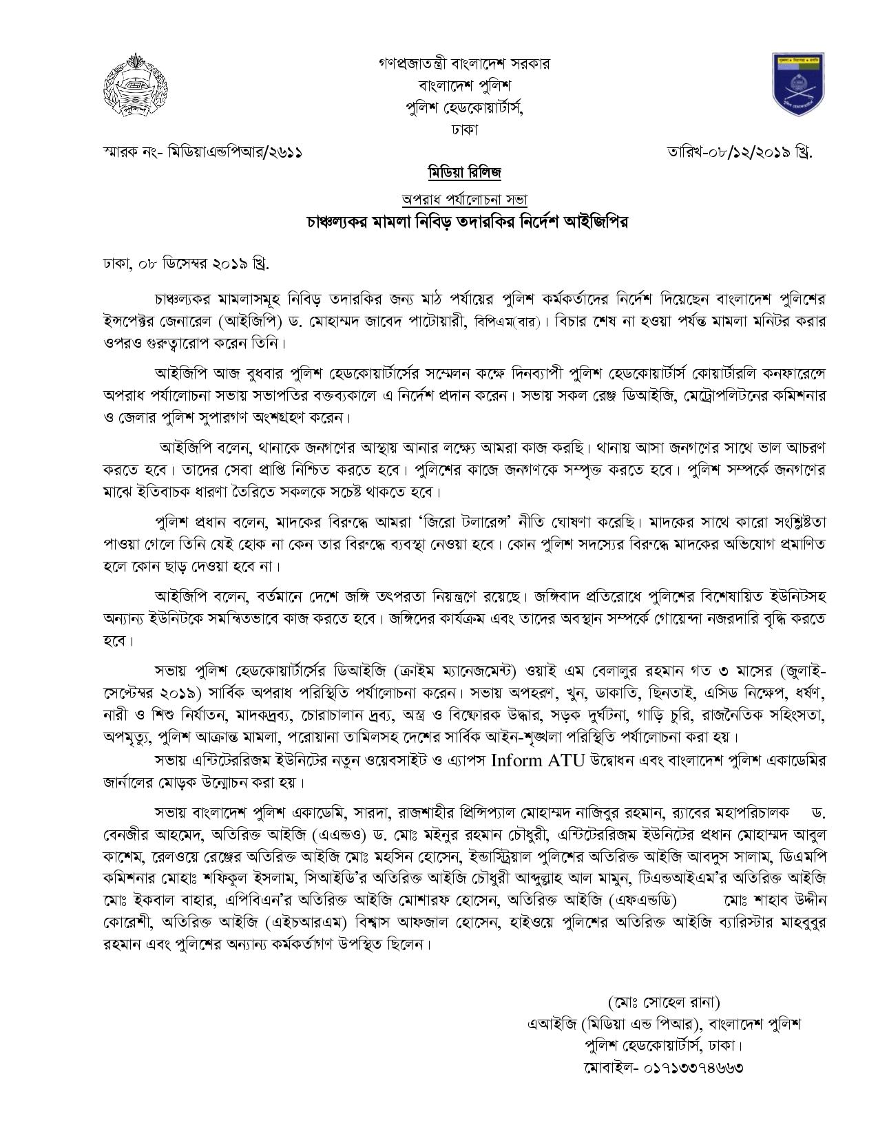 | 189 | Press Release on 08-12-2019: অপরাধ পর্যালোচনা সভা- চাঞ্চল্যকর মামলা নিবিড় তদারকির নির্দেশ আইজিপির | 08-12-2019 | View |