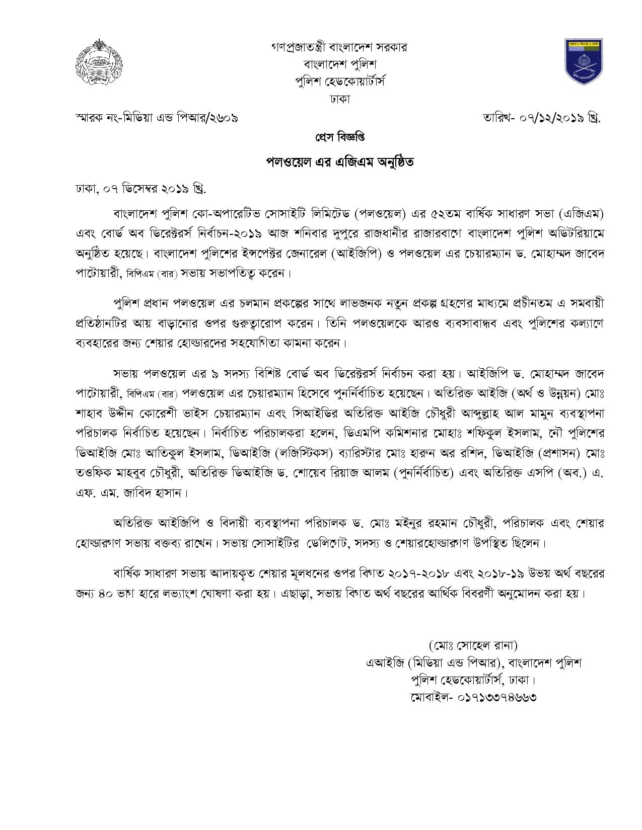 | 190 | Press Release on 07-12-2019: পলওয়েল এর এজিএম অনুষ্ঠিত | 07-12-2019 | View |
