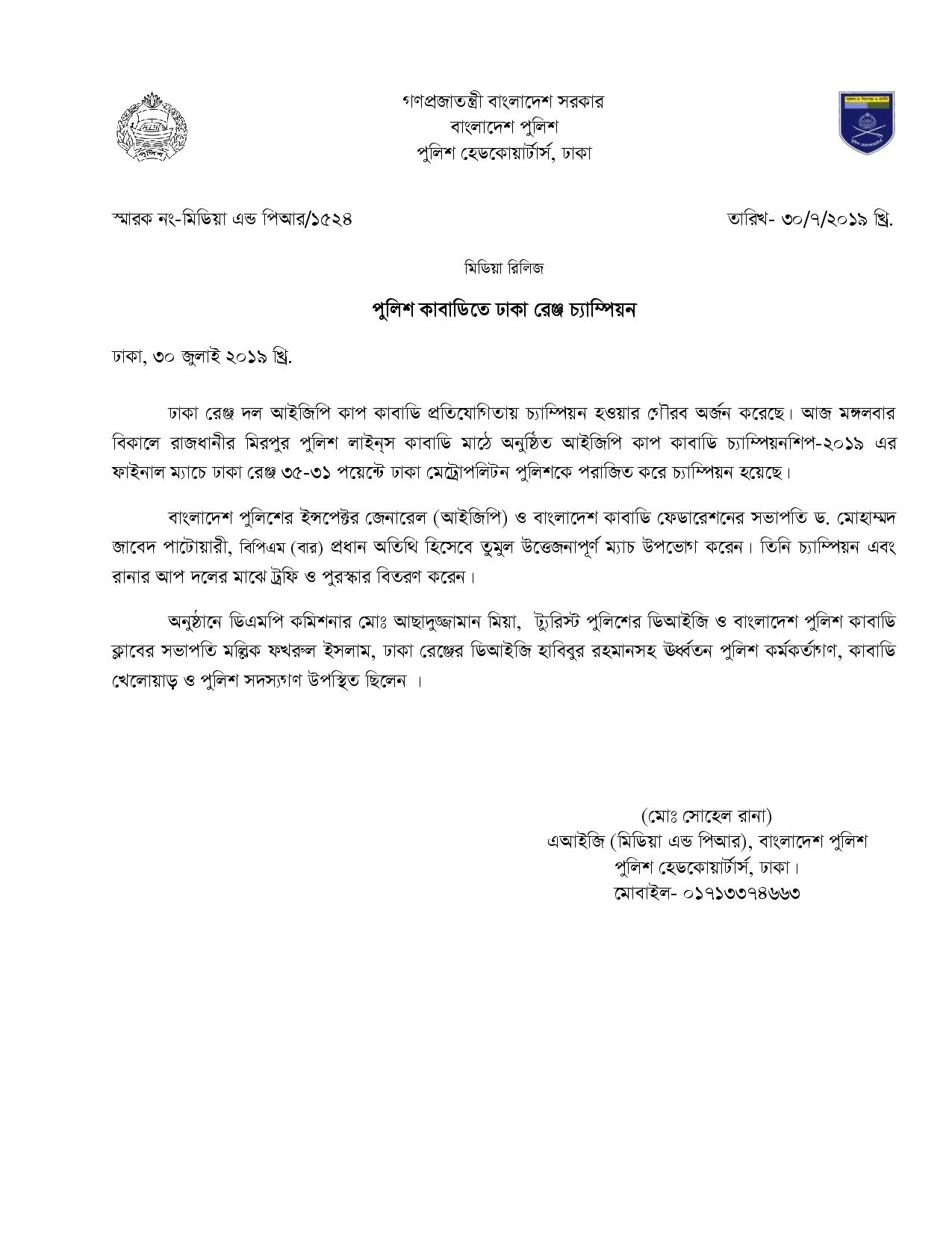 | 213 | Press Release on 30-07-2019: পুলিশ কাবাডিতে ঢাকা রেঞ্জ চ্যাম্পিয়ন | 30-07-2019 | View |
