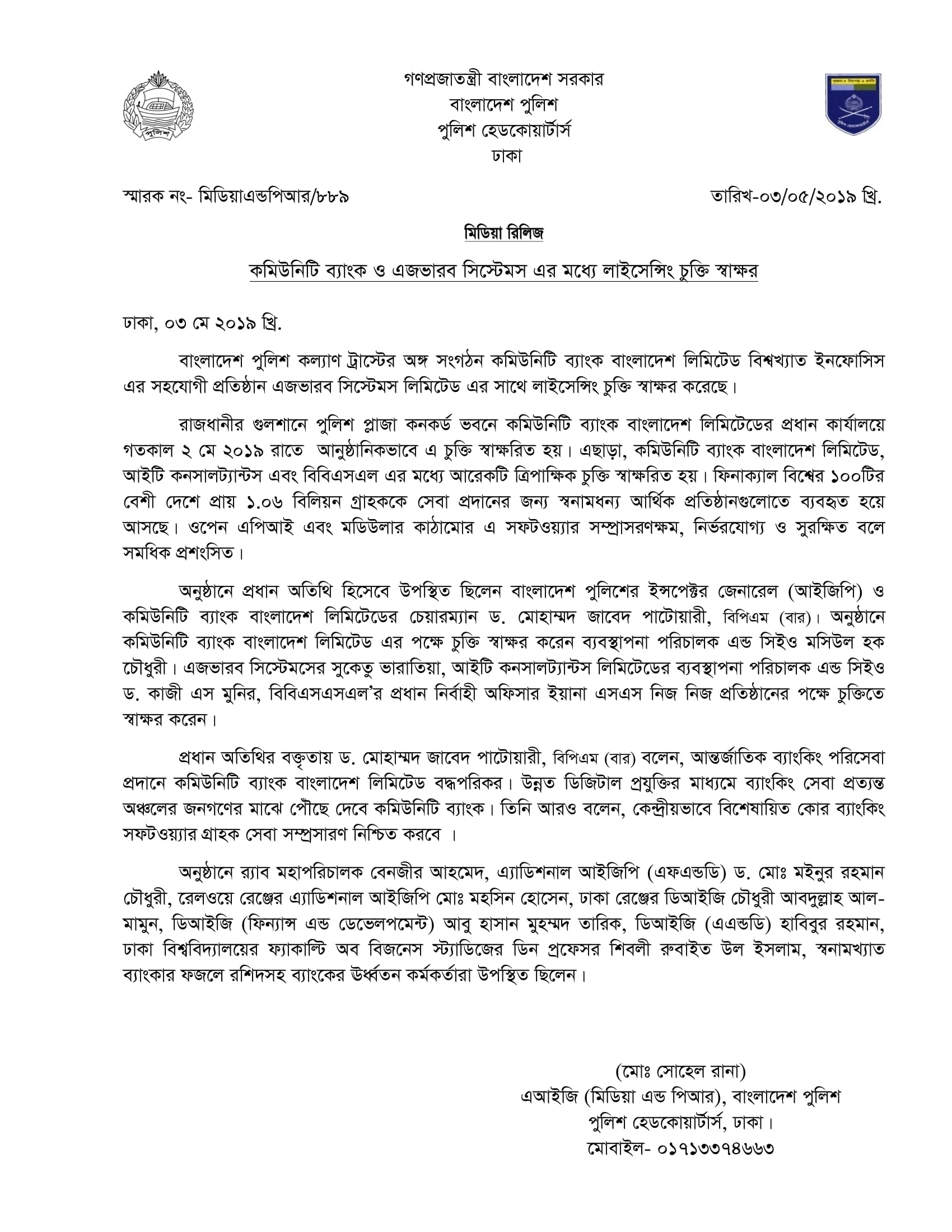 | 219 | Press Release on 03-05-2019: কমিউনিটি ব্যাংক ও এজভারব সিস্টেমস এর মধ্যে লাইসেন্সিং চুক্তি স্বাক্ষর | 03-05-2019 | View |