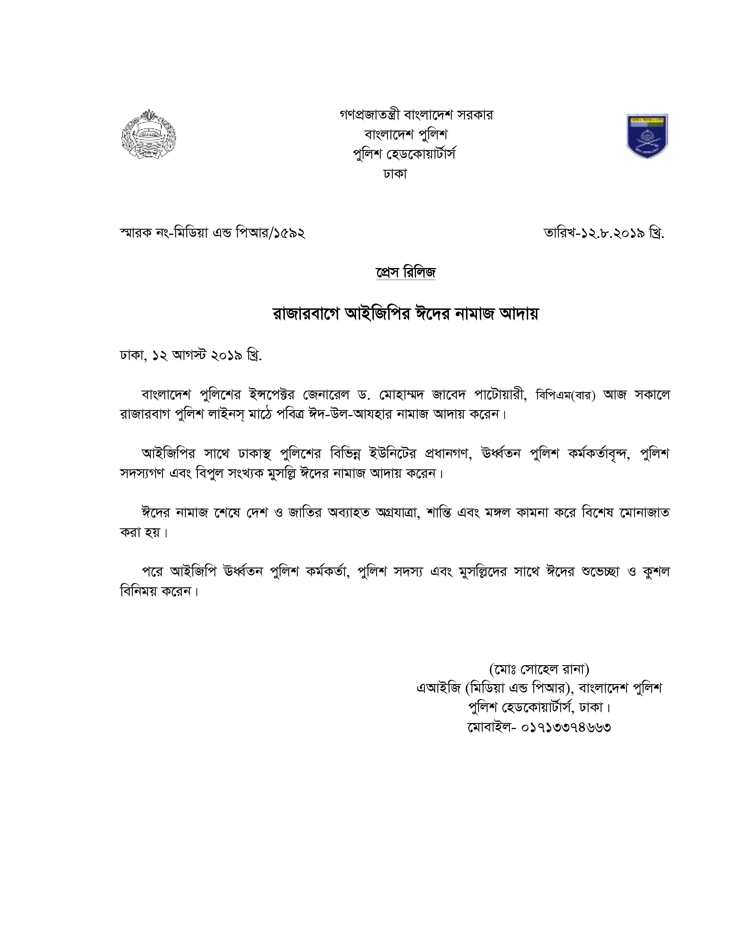 | 211 | Press Release on 12-08-2019: রাজারবাগে আইজিপির ঈদের নামাজ আদায় | 12-08-2019 | View |