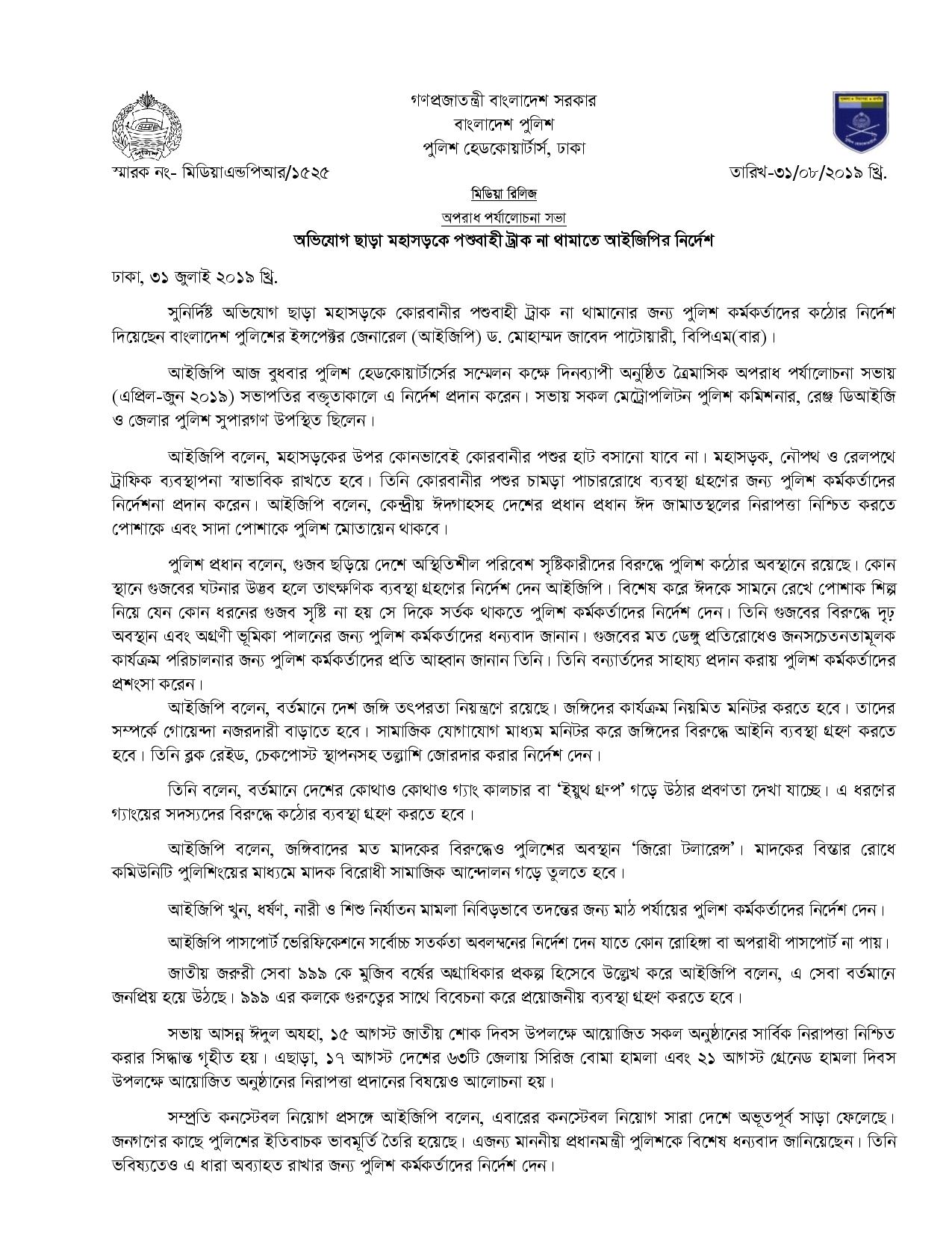 | 212 | Press Release on 31-07-2019: অভিযোগ ছাড়া মহাসড়কে পশুবাহী ট্রাক না থামাতে আইজিপির নির্দেশ | 31-07-2019 | View |