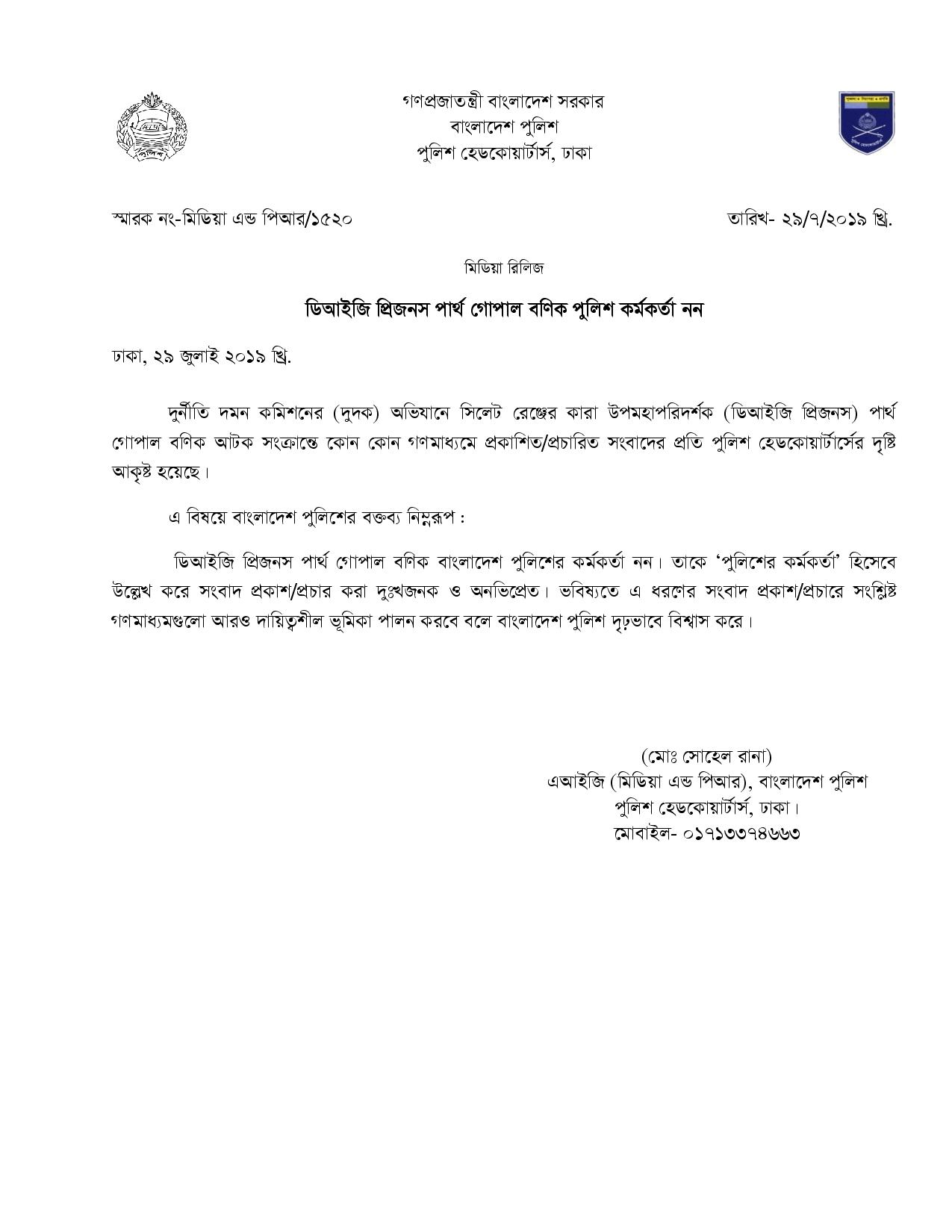 | 214 | Press Release on 30-07-2019: ডিআইজি প্রিজনস পার্থ গোপাল বণিক পুলিশ কর্মকর্তা নন | 30-07-2019 | View |