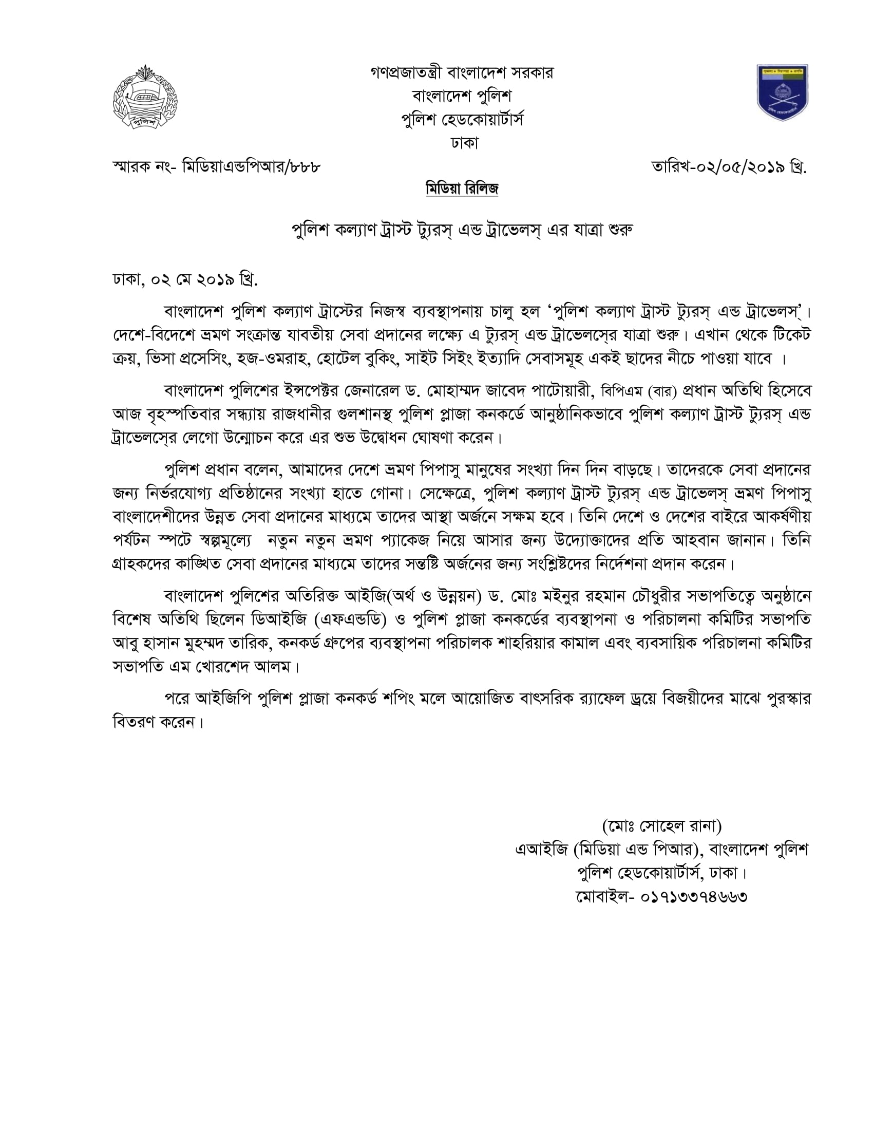 | 220 | Press Release on 02-05-2019: পুলিশ কল্যাণ ট্রাস্ট ট্যুরস্ এন্ড ট্রাভেলস্ এর যাত্রা শুরু | 02-05-2019 | View |