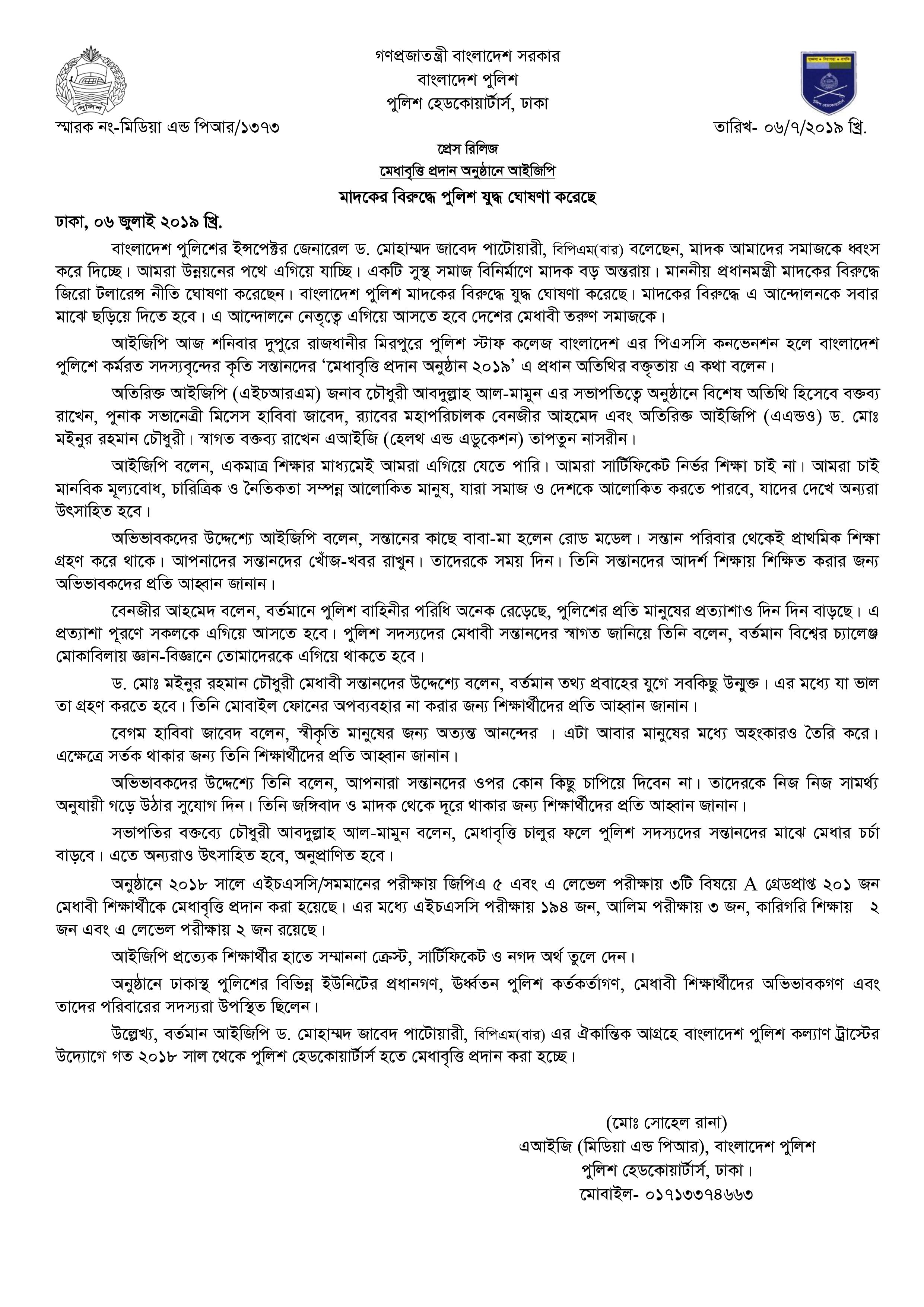 | 215 | Press Release on 06-07-2019: মেধাবৃত্তি প্রদান অনুষ্ঠানে আইজিপি, মাদকের বিরুদ্ধে পুলিশ যুদ্ধ ঘোষণা করেছে | 06-07-2019 | View |