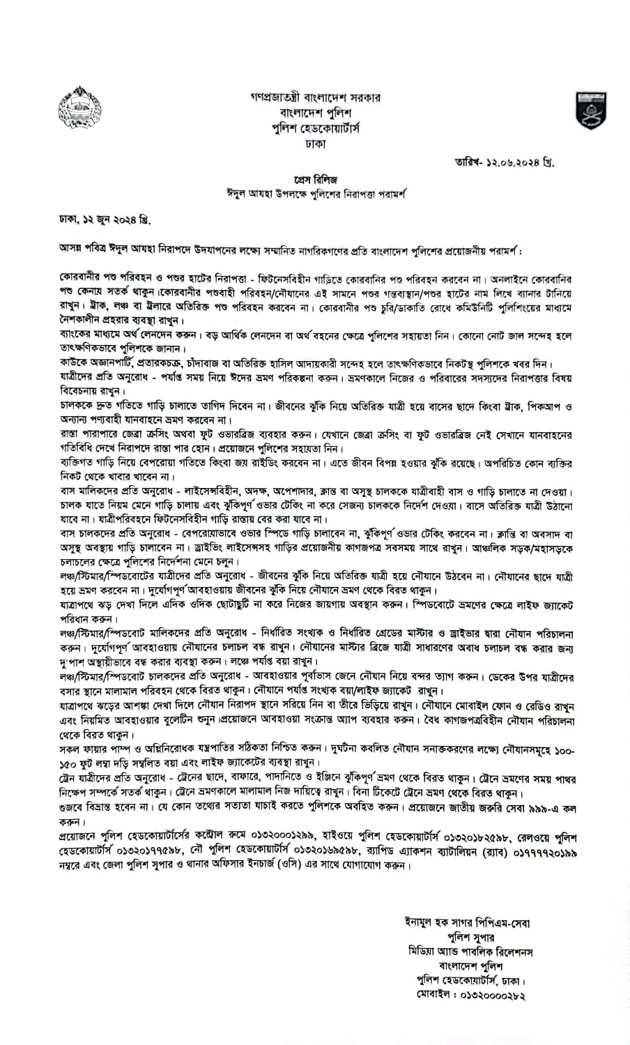 | 30 | Press Release on 12.06.24: ঈদুল আযহা উপলক্ষে পুলিশের নিরাপত্তা পরামর্শ | 12-06-2024 | View |