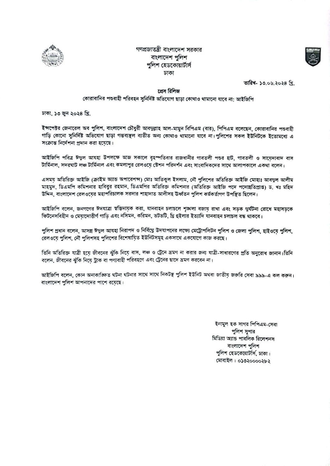 | 29 | Press Release on 13.06.24: কোরাবানির পশুবাহী পরিবহন সুনির্দিষ্ট অভিযোগ ছাড়া কোথাও থামানো যাবে না আইজিপি | 13-06-2024 | View |