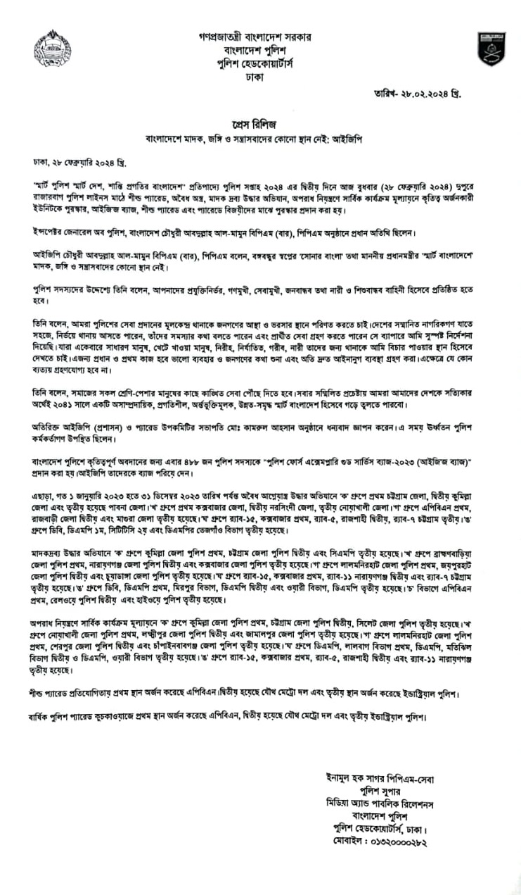 | 57 | Press Release on 28.02.24: বাংলাদেশে মাদক, জঙ্গি ও সন্ত্রাসবাদের কোনো স্থান নেই: আইজিপি | 28-02-2024 | View |