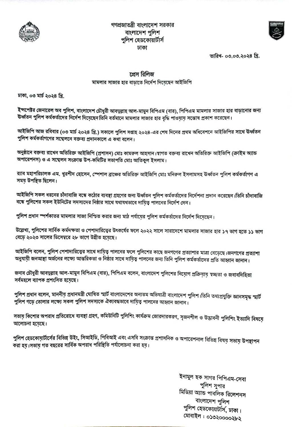 | 53 | Press Release on 03.03.24: মামলার সাজার হার বাড়াতে নির্দেশ দিয়েছেন আইজিপি | 03-03-2024 | View |