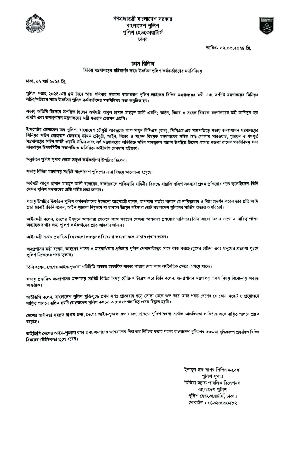 | 55 | Press Release on 02.03.24: বিভিন্ন মন্ত্রণালয়ের মন্ত্রিবর্গের সাথে ঊর্ধ্বতন পুলিশ কর্মকর্তাগণের মতবিনিময় | 02-03-2024 | View |