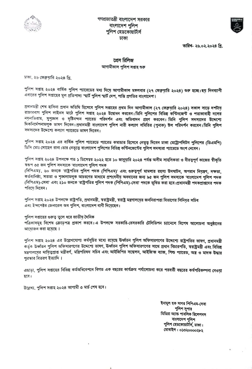 | 58 | Press Release on 26.02.24: আগামীকাল পুলিশ সপ্তাহ শুরু | 26-02-2024 | View |