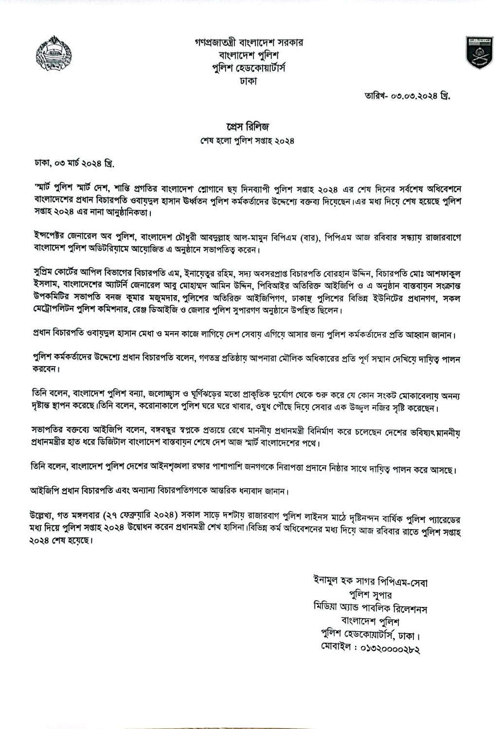 | 51 | Press Release on 03.03.24: শেষ হলো পুলিশ সপ্তাহ ২০২৪ | 03-03-2024 | View |