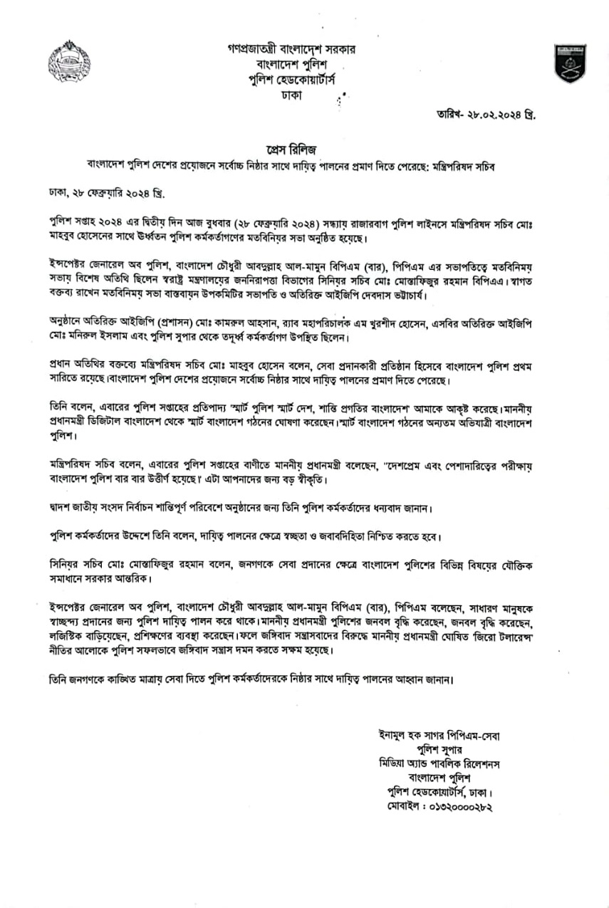 | 56 | Press Release on 28.02.24: বাংলাদেশ পুলিশ দেশের প্রয়োজনে সর্বোচ্চ নিষ্ঠার সাথে দায়িত্ব পালনের প্রমাণ দিতে পেরেছে: মন্ত্রিপরিষদ সচিব | 28-02-2024 | View |