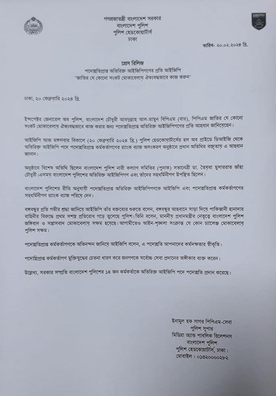 | 60 | Press Release on 20.02.24 : পদোন্নতিপ্রাপ্ত অতিরিক্ত আইজিপিগণের প্রতি আইজিপি "জাতির যে কোনো সংকট মোকাবেলায় ঐক্যবদ্ধভাবে কাজ করুন" | 20-02-2024 | View |