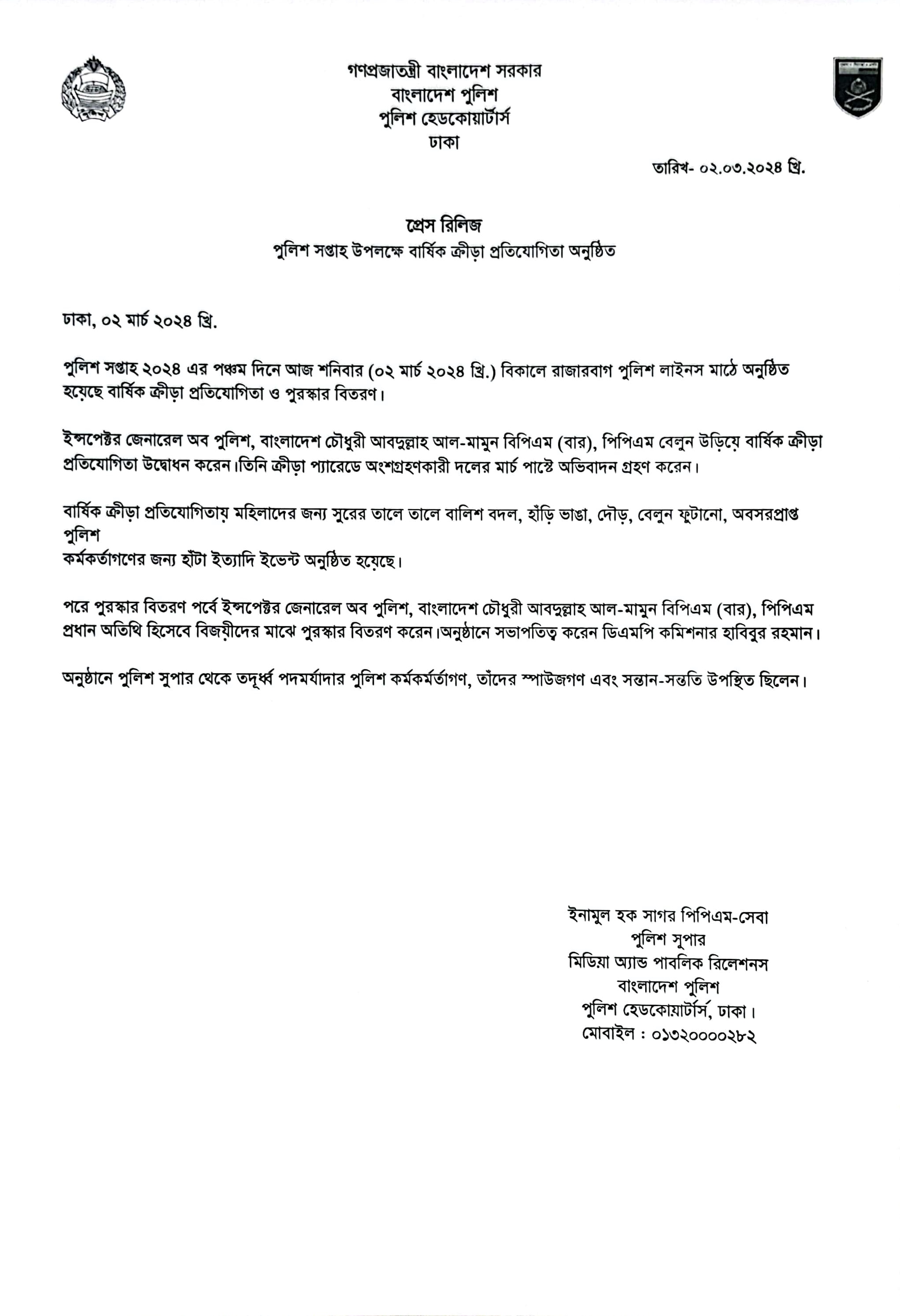 | 54 | Press Release on 02.03.24: পুলিশ সপ্তাহ উপলক্ষে বার্ষিক ক্রীড়া প্রতিযোগিতা অনুষ্ঠিত | 02-03-2024 | View |