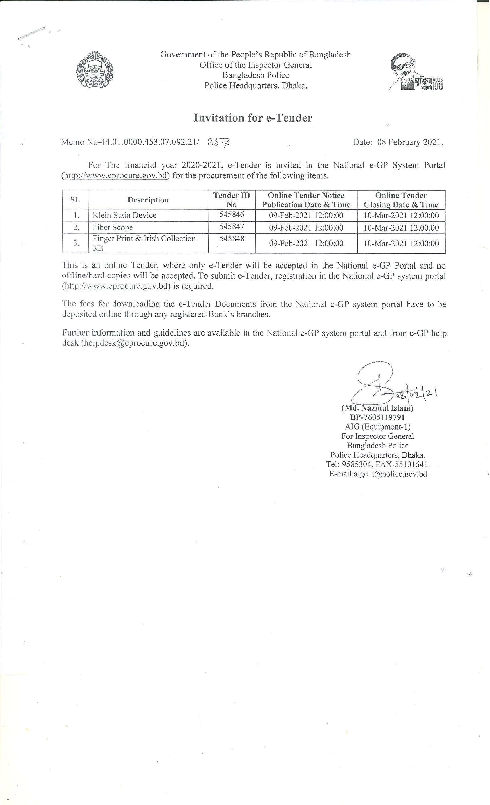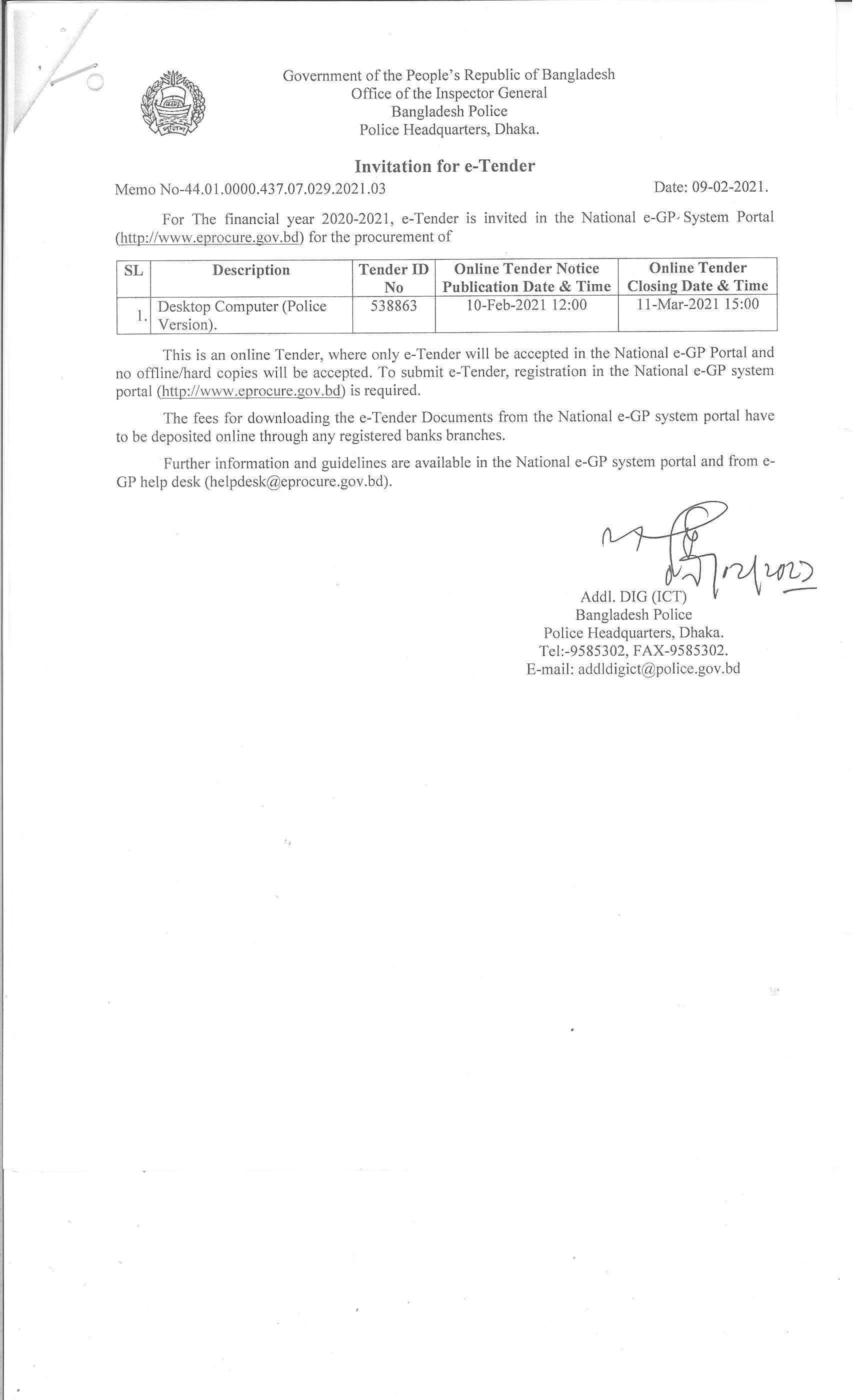 | 1715 | Invitation for e- Tender. (Police Telecom, Rajarbag, Dhaka) | 22 -03-2021 | 22-03-2021 | View | Download |