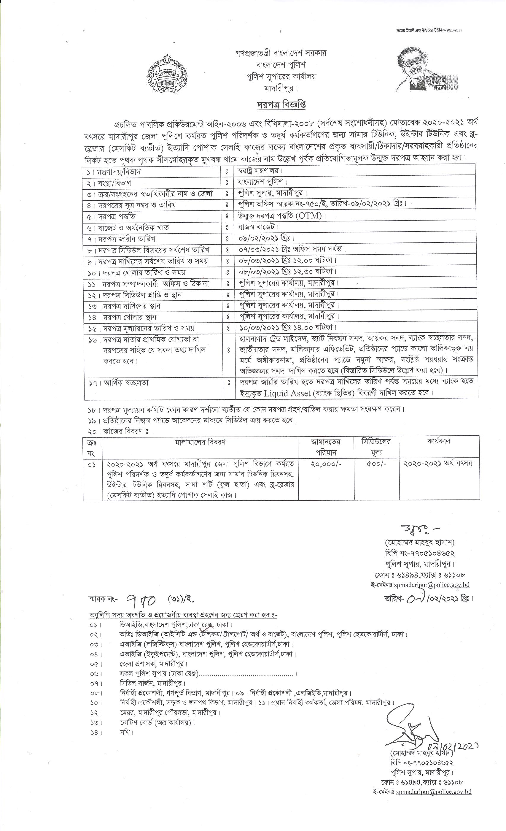 | 1718 | পুলিশ অফিসারের জন্য টিউনিক সেলাই কাজ,(পুুলিশ সুপার মাদারীপুর) | 08-03-2021 | 08-03-2021 | View | Download |