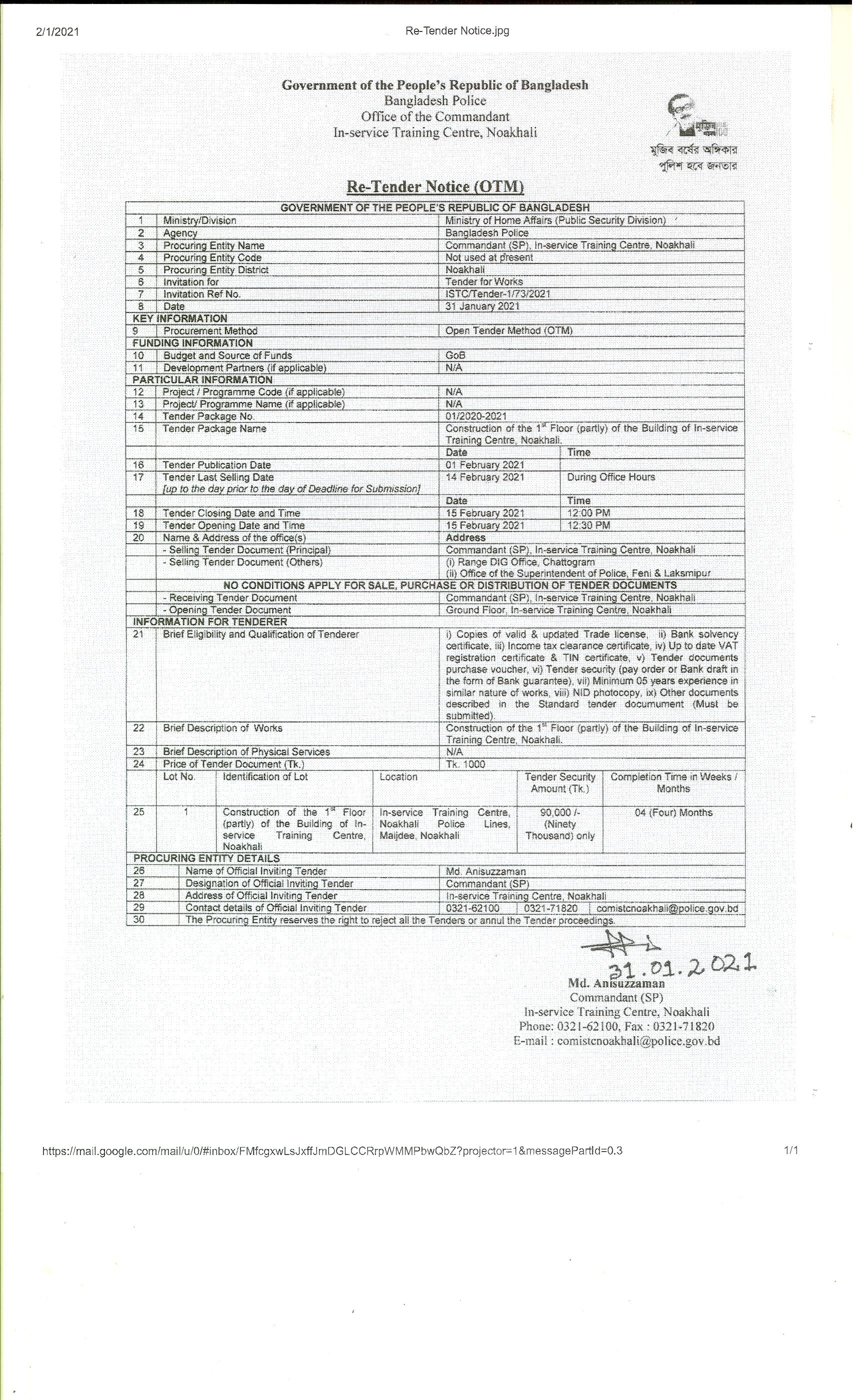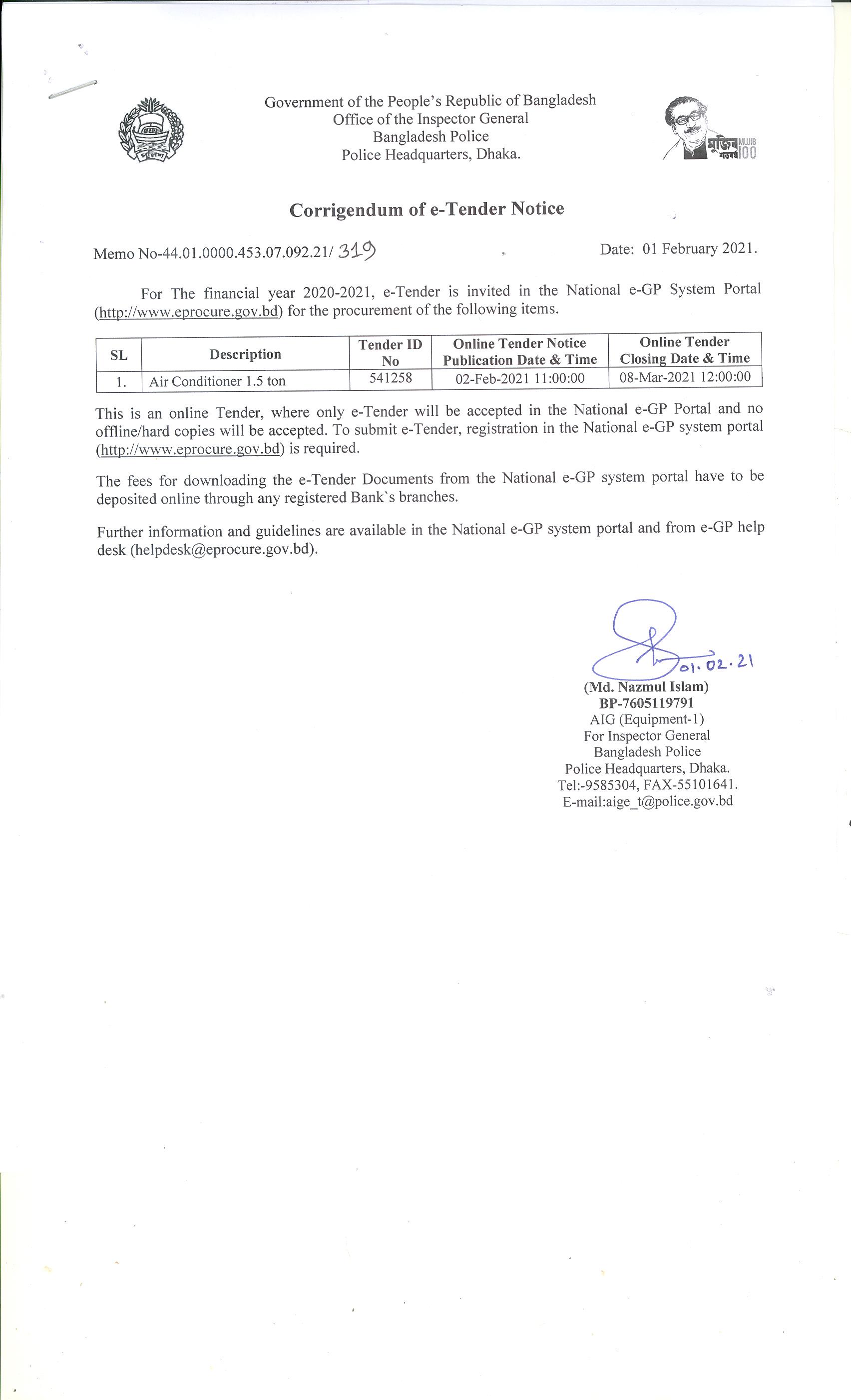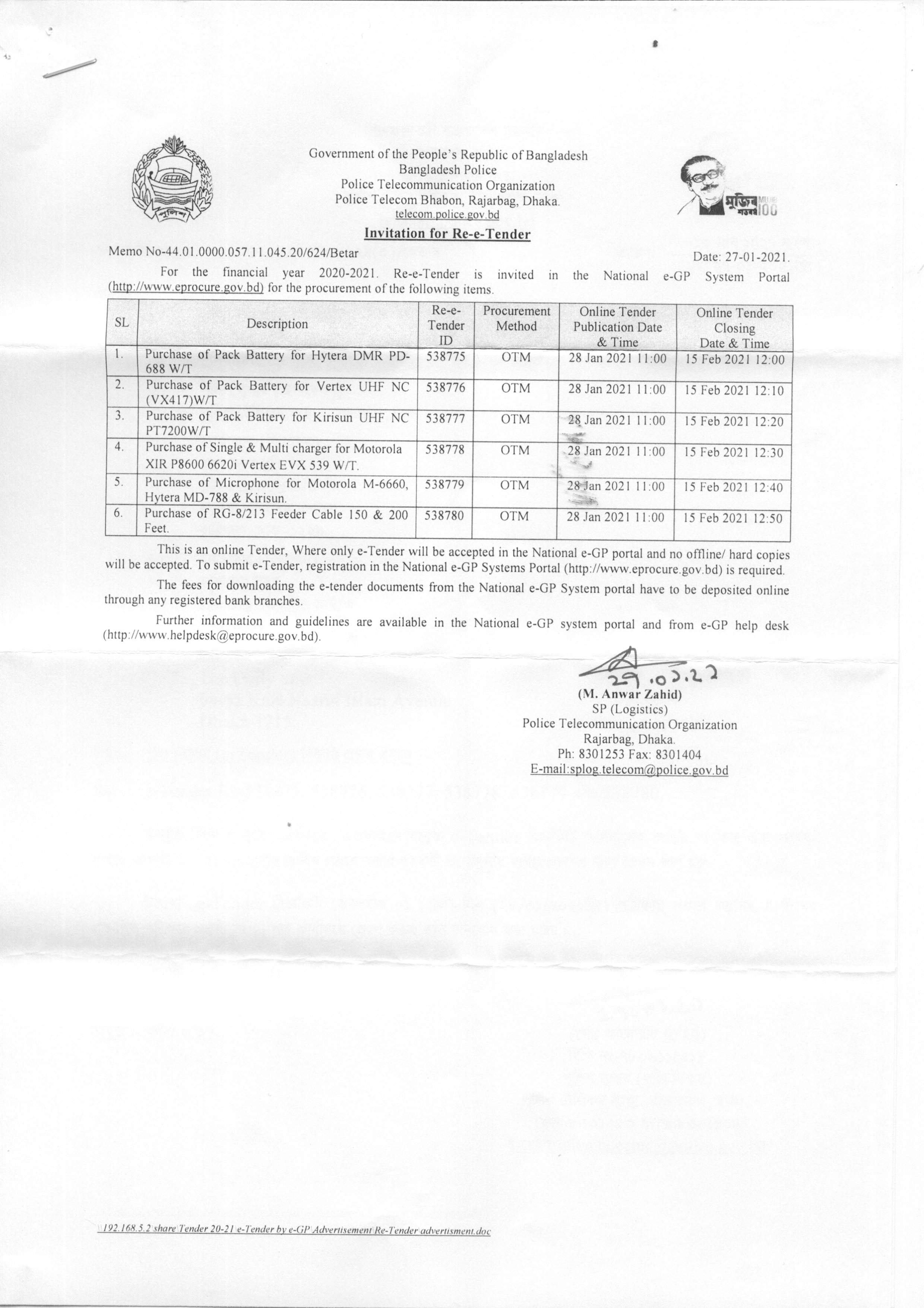 | 1727 | Invitation for Re- e- Tender. (PHQ), 31- 01-2021খ্রিঃ। | 15-02-2021 | 15-02-2021 | View | Download |