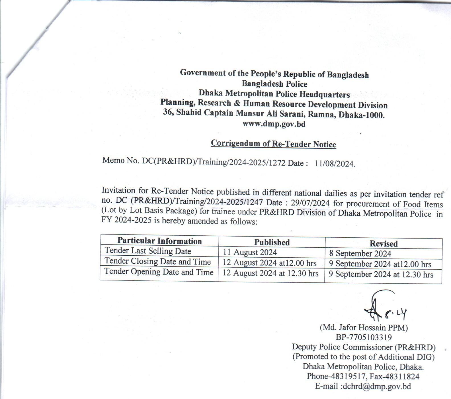 | 435 | Corrigendum of Re- Tender Notice (DMP, Dhaka, ) | 09-09-2024 | 09-09-2024 | View | Download |