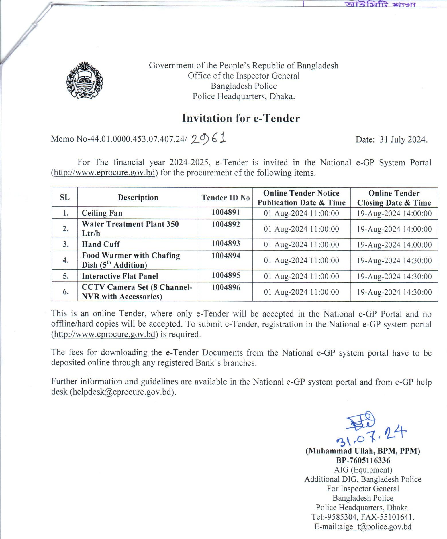 | 454 | Invitation for e-Tender (Equipment, PHQ, Dhaka,) | 19-08-2024 | 19-08-2024 | View | Download |