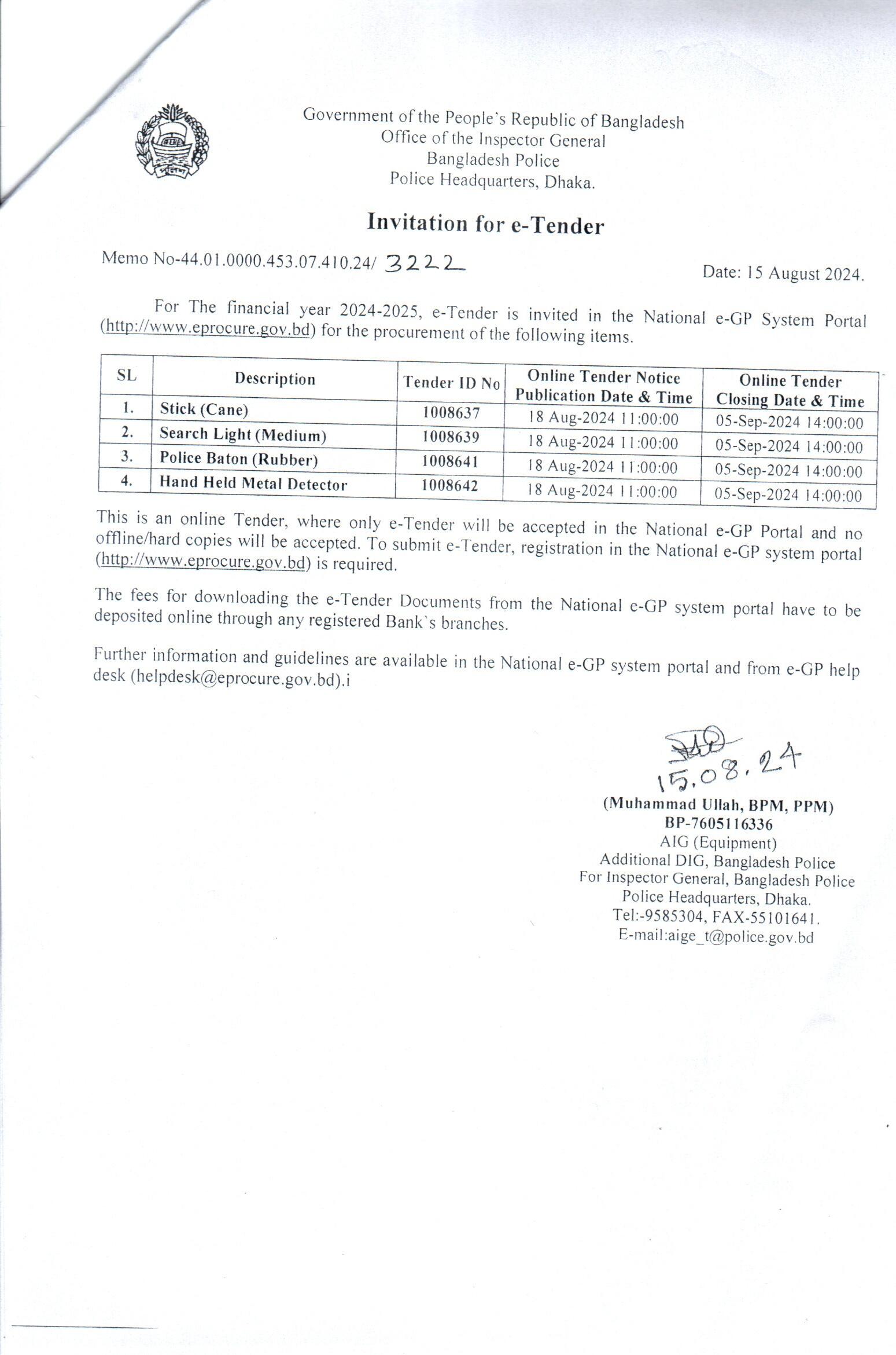 | 451 | Invitation for e-Tender (Equipment, PHQ, Dhaka,)3222 | 05-09-2024 | 05-09-2024 | View | Download |