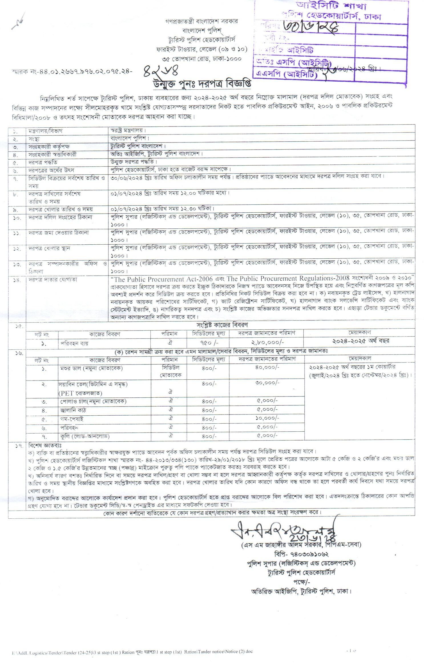 | 476 | রেশন সামগ্রী সরবরাহ (Tourist Police HQ, Dhaka) | 01-07-2024 | 01-07-2024 | View | Download |