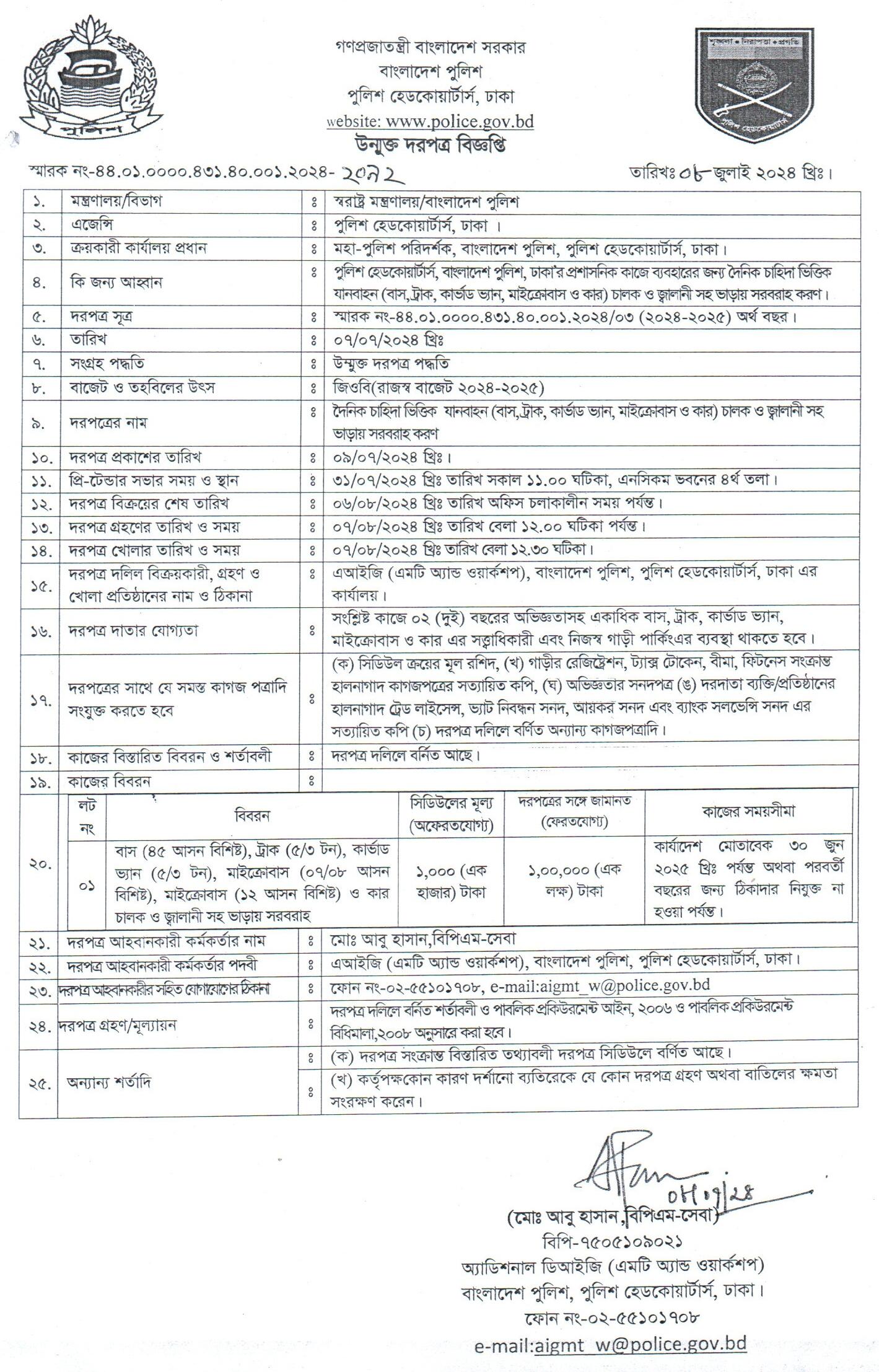 | 472 | যানবাহন(চালক ও জালানী সহ) ভাড়ায় সরবরাহ(PHQ, Dhaka) | 07-08-2024 | 07-08-2024 | View | Download |