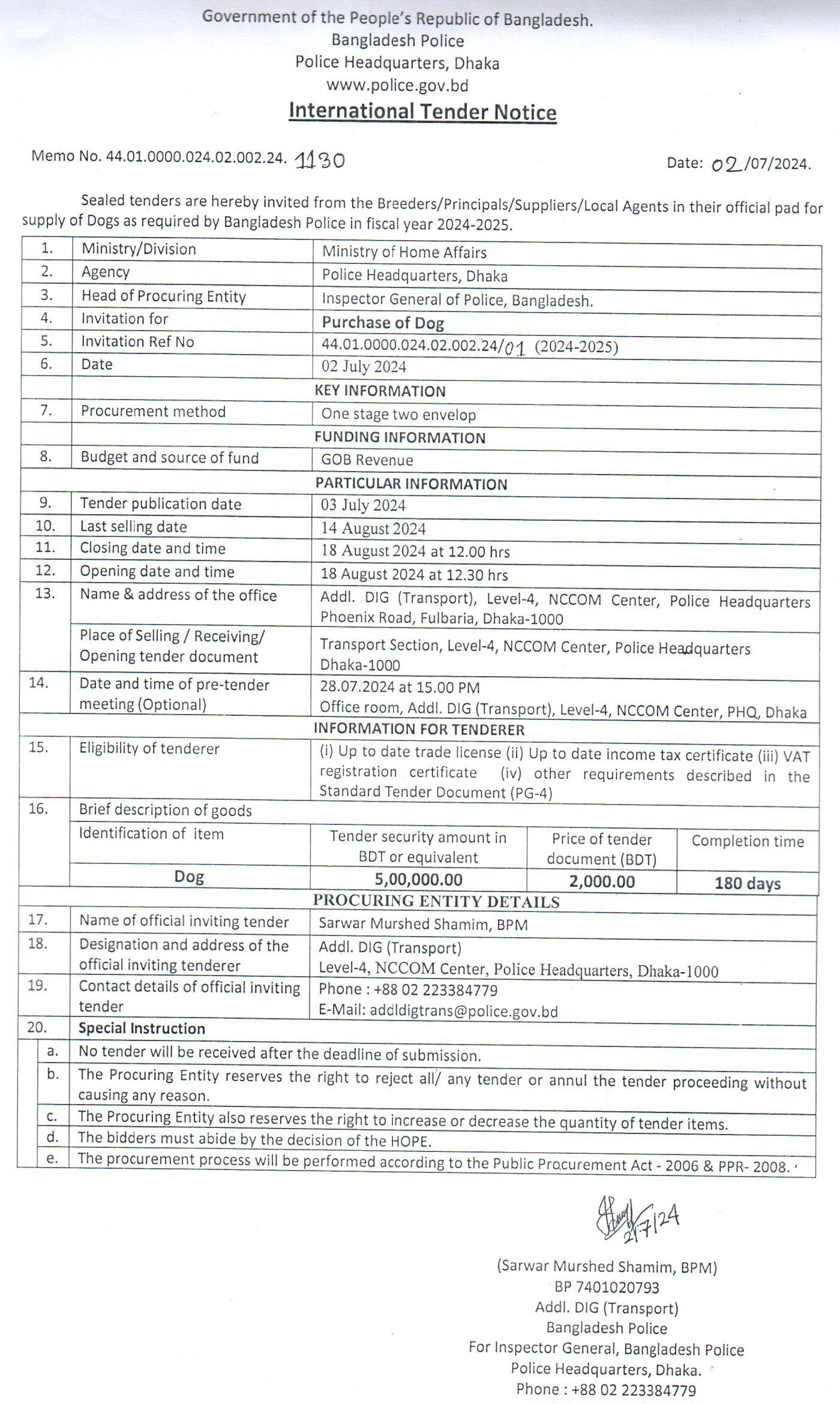 | 474 | Purchase of Dog (Transport, PHQ, Dhaka) | 18-08-2024 | 18-08-2024 | View | Download |