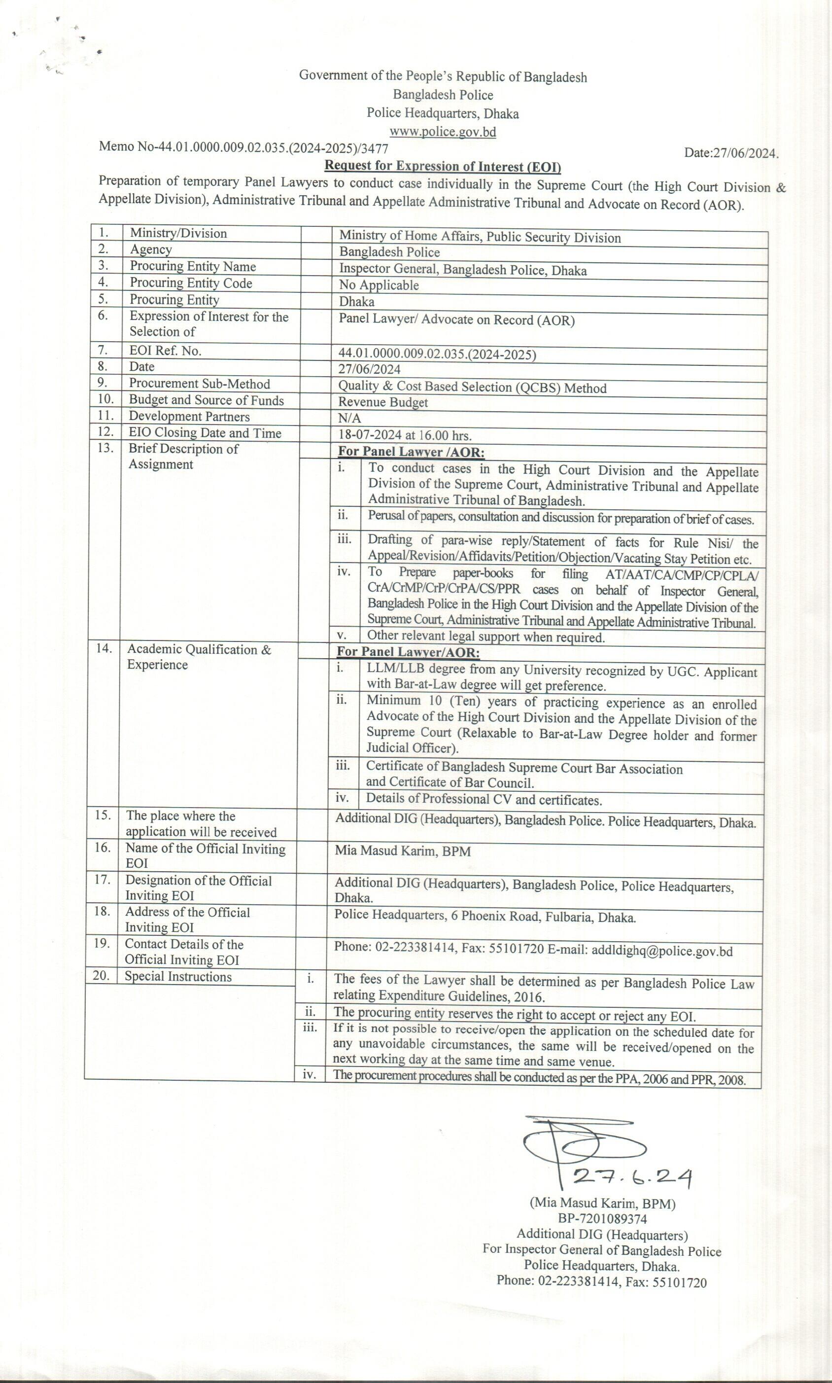 | 477 | Request for Expression of Interest(EOI), (PHQ, Dhaka) | 18-07-2024 | 18-07-2024 | View | Download |
