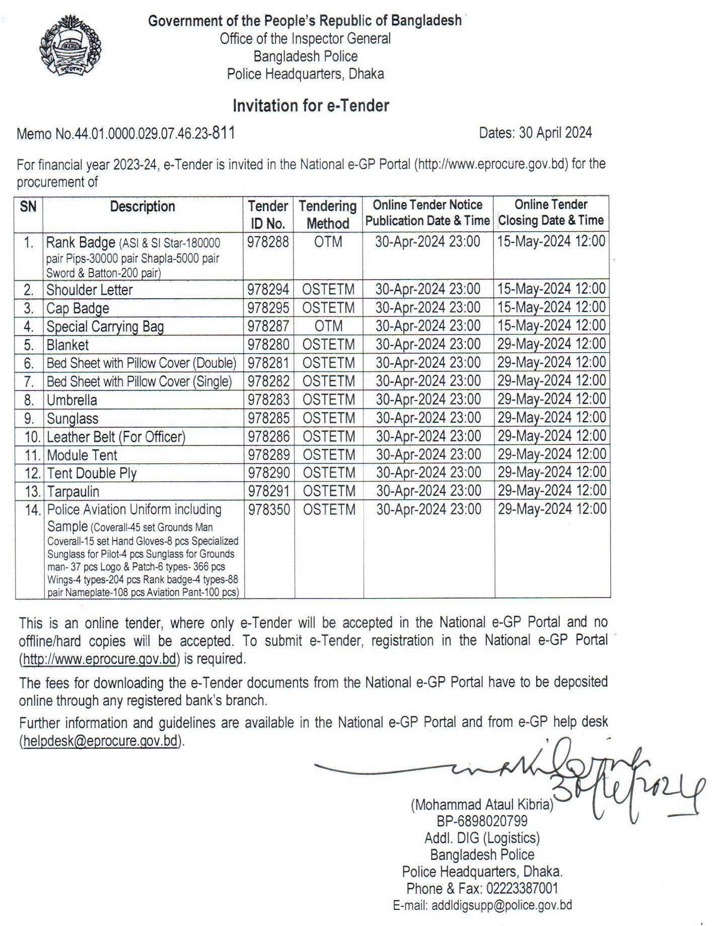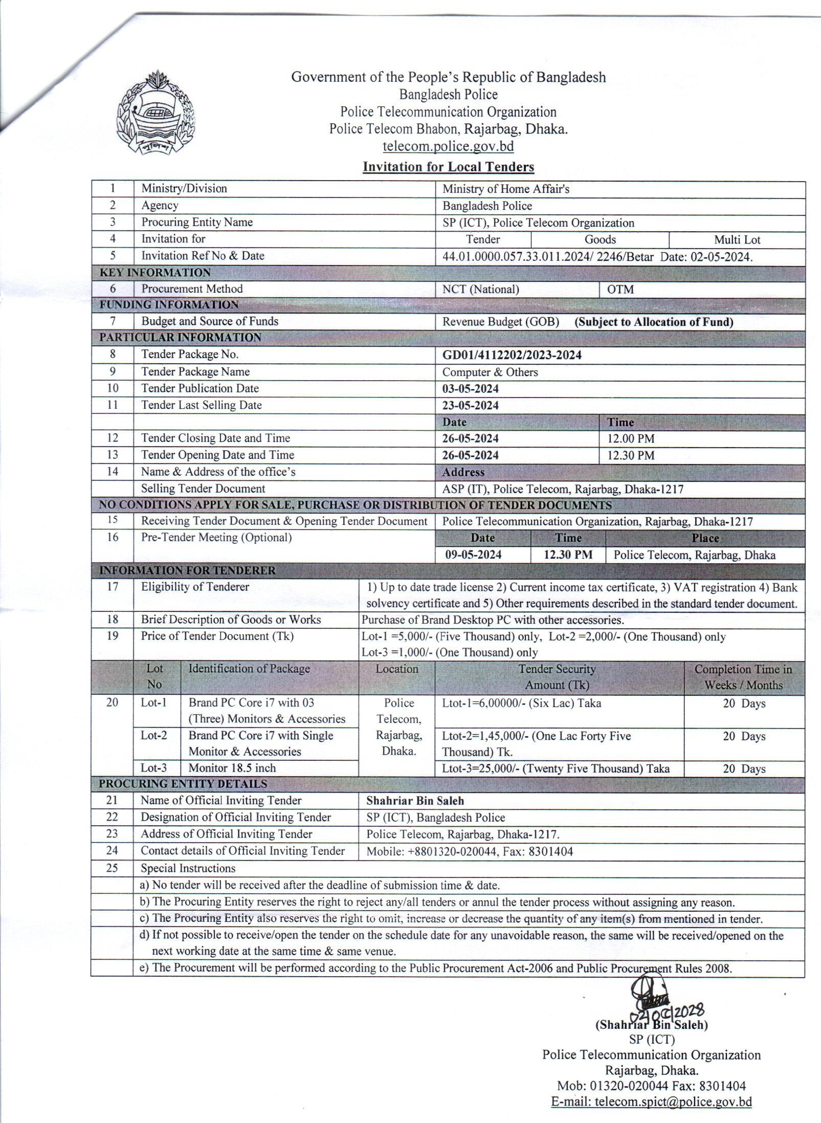 | 569 | Purchase of Brand Desktop PC With accessories. (Police Telecom, Dhaka) | 26-05-2024 | 26-05-2024 | View | Download |