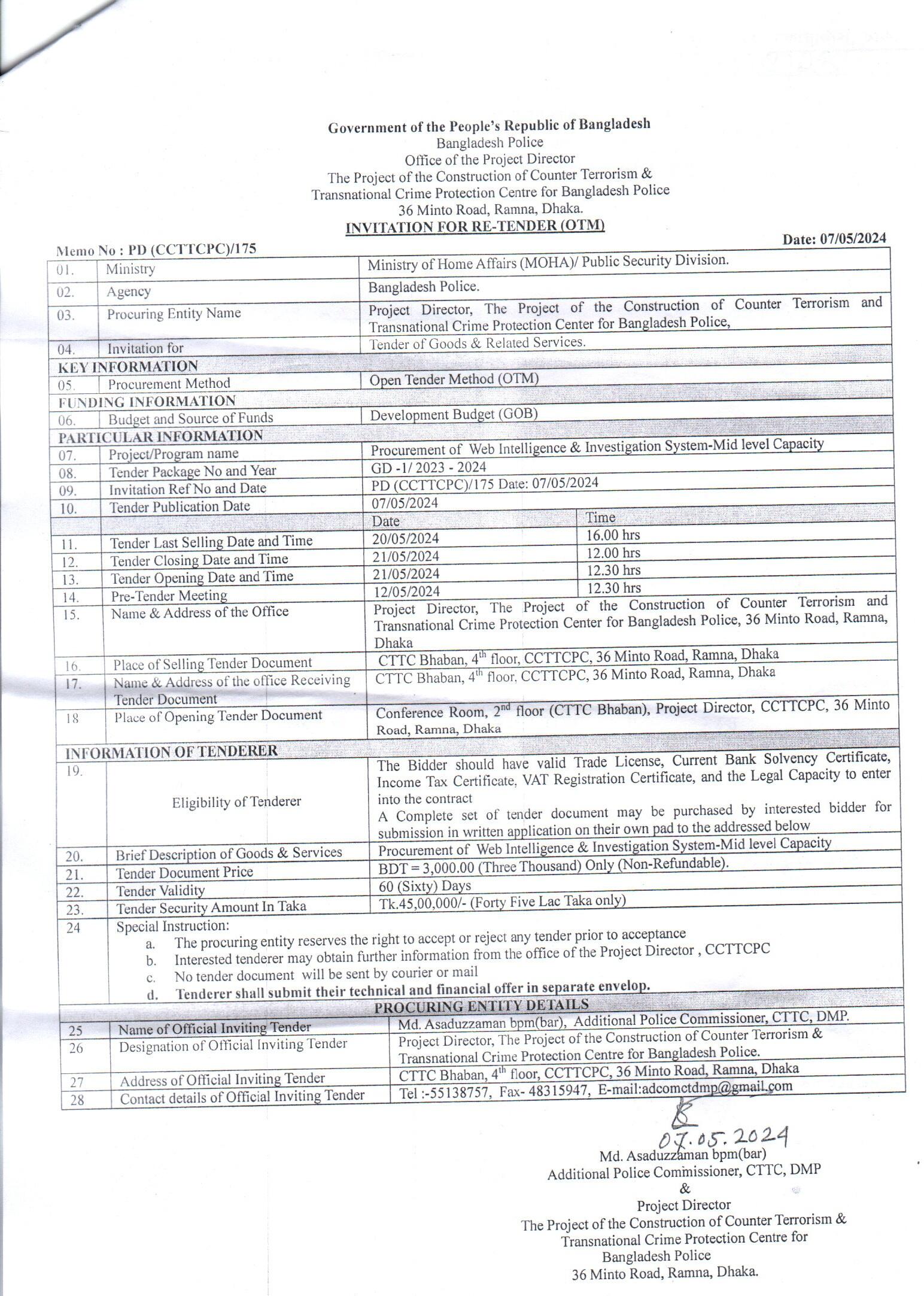 | 566 | Purchase of web Intelligence & Investigation System Mid level Capacity. (CTTC, DMP, Dhaka) | 21-05-2024 | 21-05-2024 | View | Download |