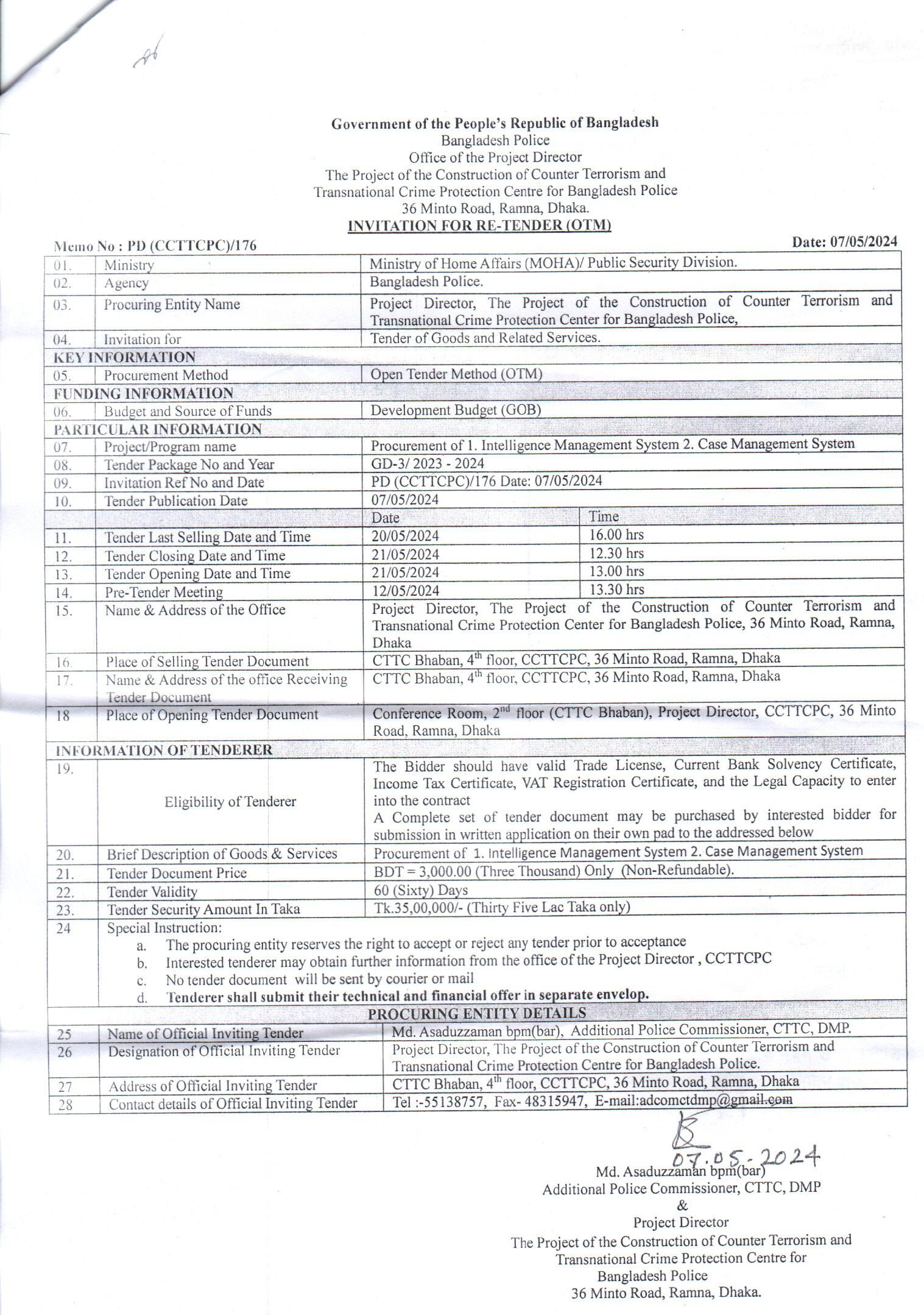 | 565 | Purchase of 1. Intelligence Management System 2. Case Management System. (CTTC, DMP, Dhaka) | 21-05-2024 | 21-05-2024 | View | Download |