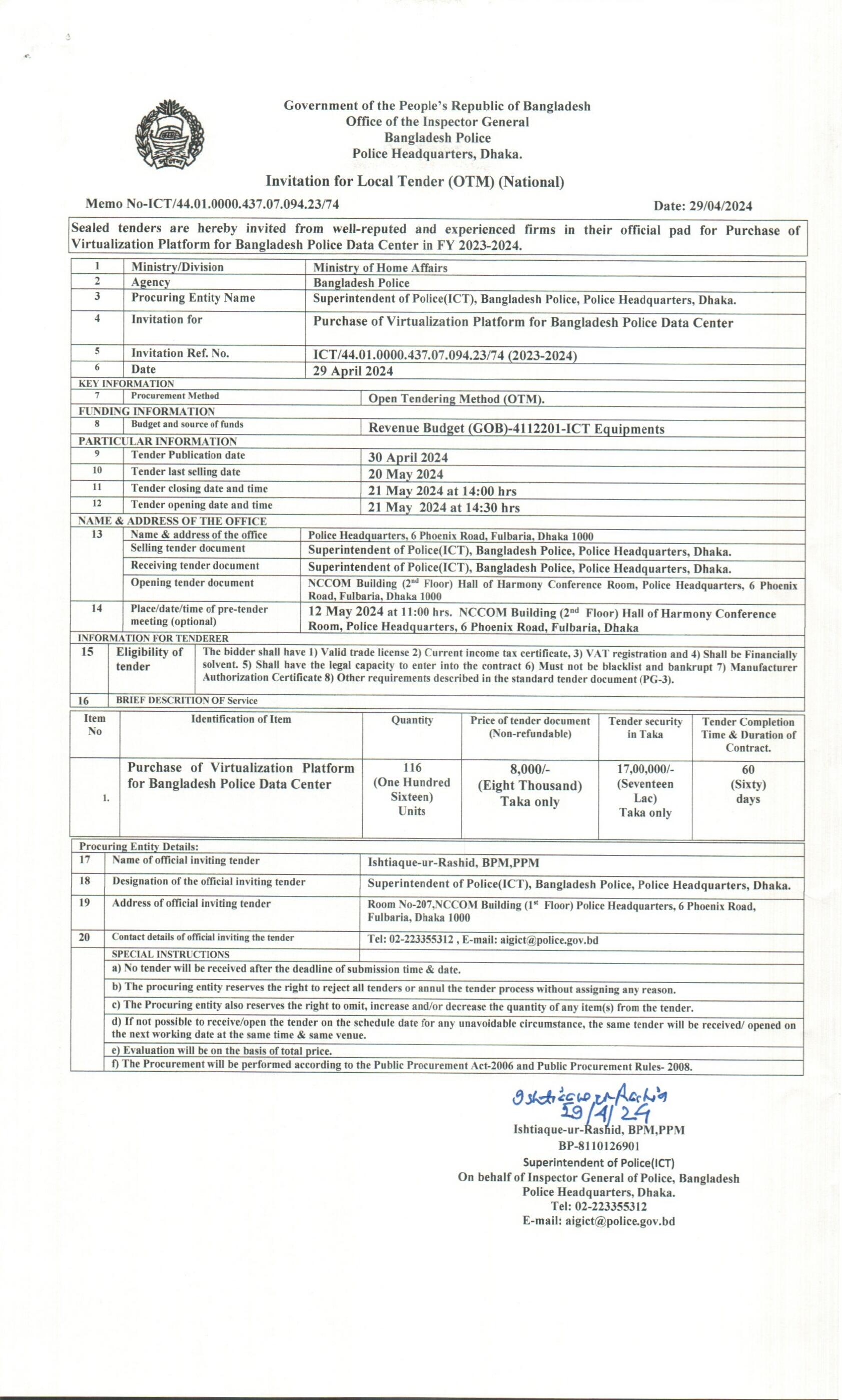 | 574 | Purchase of Virtualization Platform for BD Police Data Center (ICT, PHQ, Dhaka.) | 21-05-2024 | 21-05-2024 | View | Download |