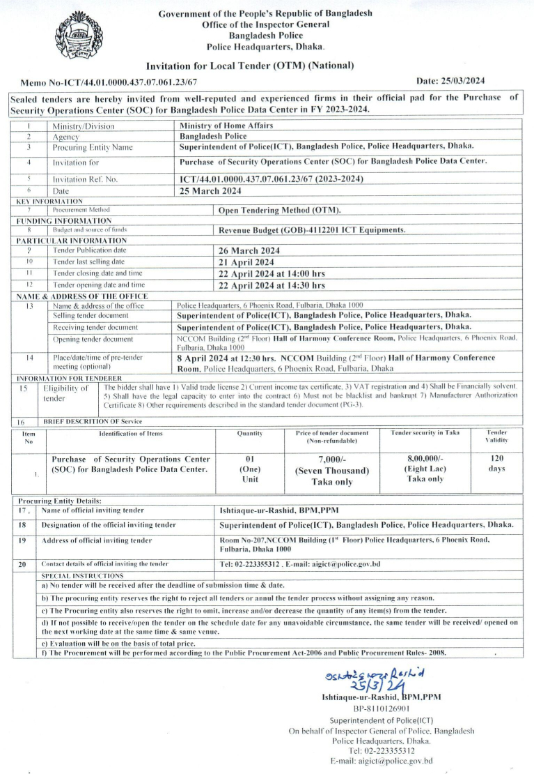 | 602 | Purchase of SOC for BD Police (ICT, PHQ, Dhaka) | 22-04-2024 | 22-04-2024 | View | Download |