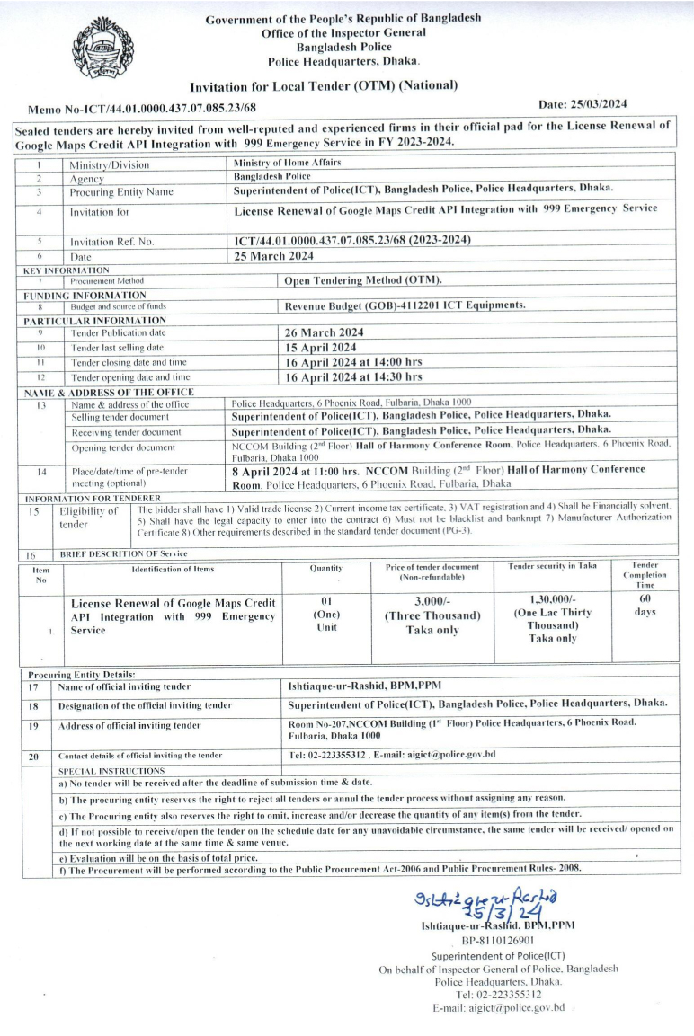 | 601 | License Renewal of Google Maps Credit API Integration with 999 Emergency Service.(ICT, PHQ, Dhaka) | 16-04-2024 | 16-04-2024 | View | Download |