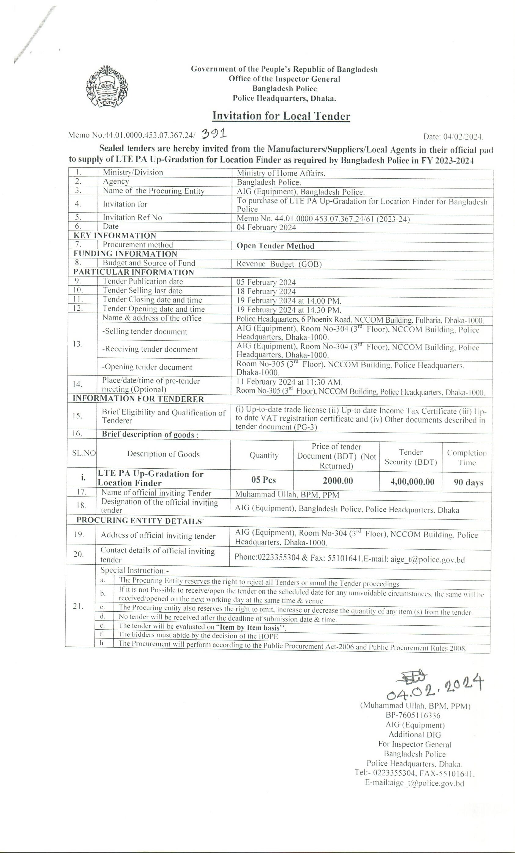 | 660 | To Purchase LTE PA Up-Gradation for Location Finder for BD Police, (Equipment, PHQ, Dhaka) | 19-02-2024 | 19-02-2024 | View | Download |