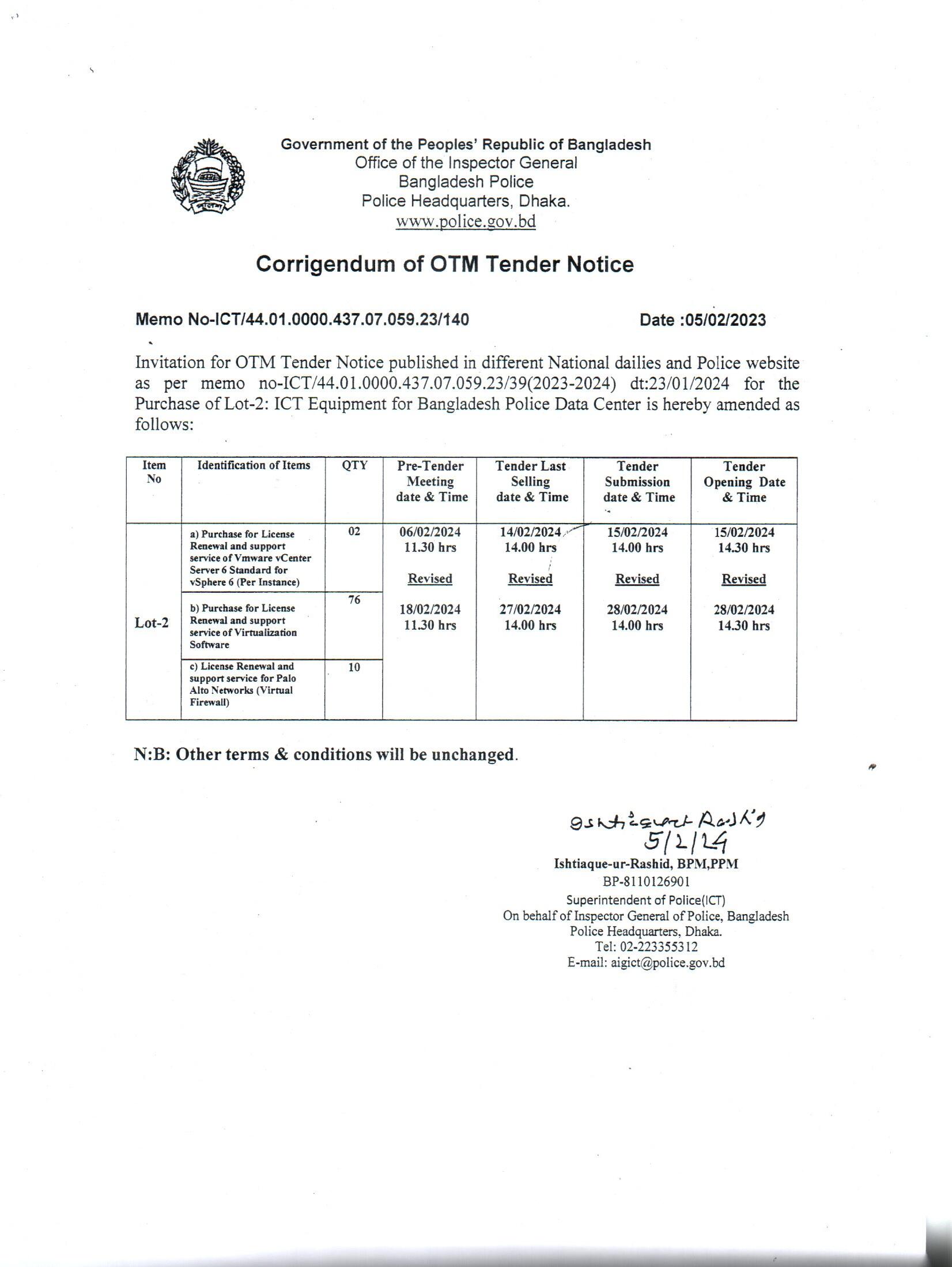 | 659 | Corrigendum for OTM Tender Notice (ICT Section, PHQ, Dhaka, Memo No - 140, Date : 05/02/23) | 28-02-2024 | 28-02-2024 | View | Download |