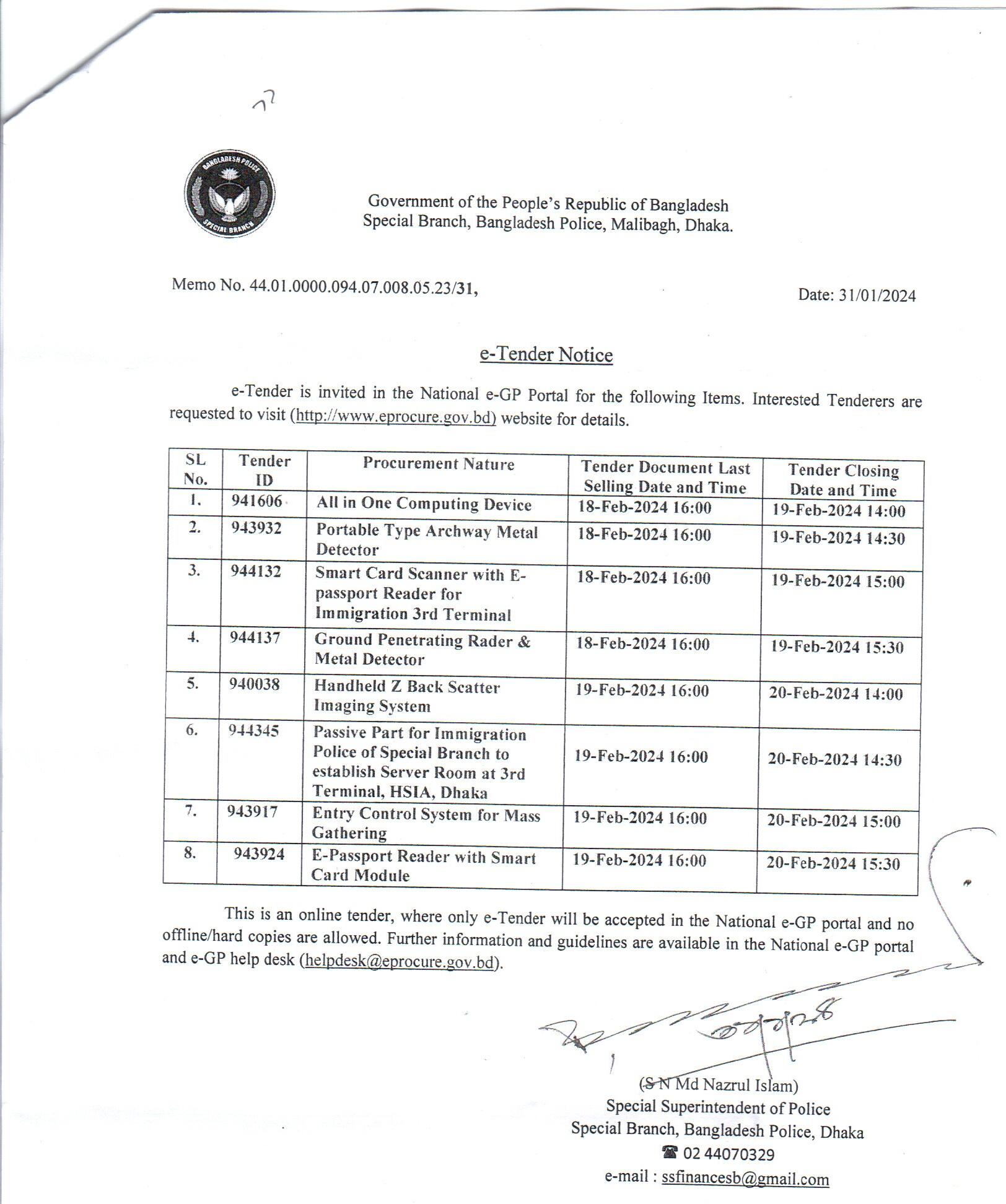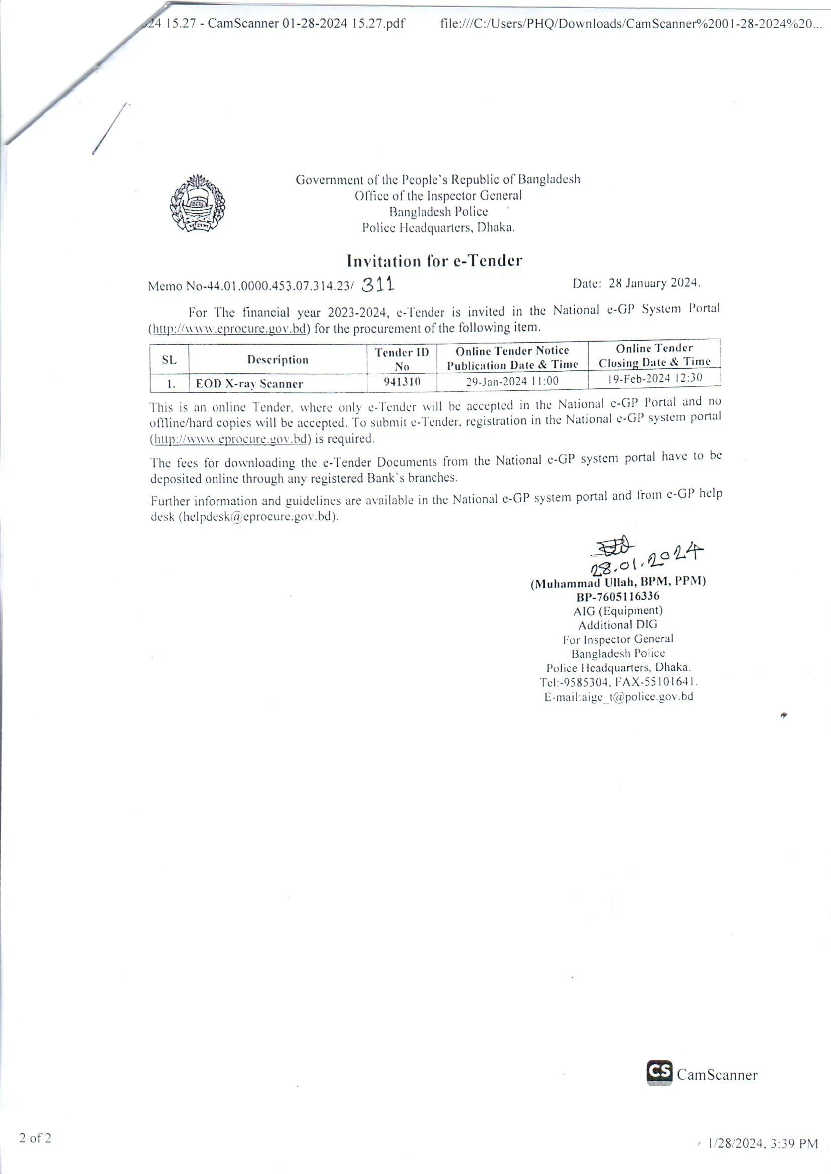 Invitation for e-Tender (Equipment, PHQ, Dhaka,)
