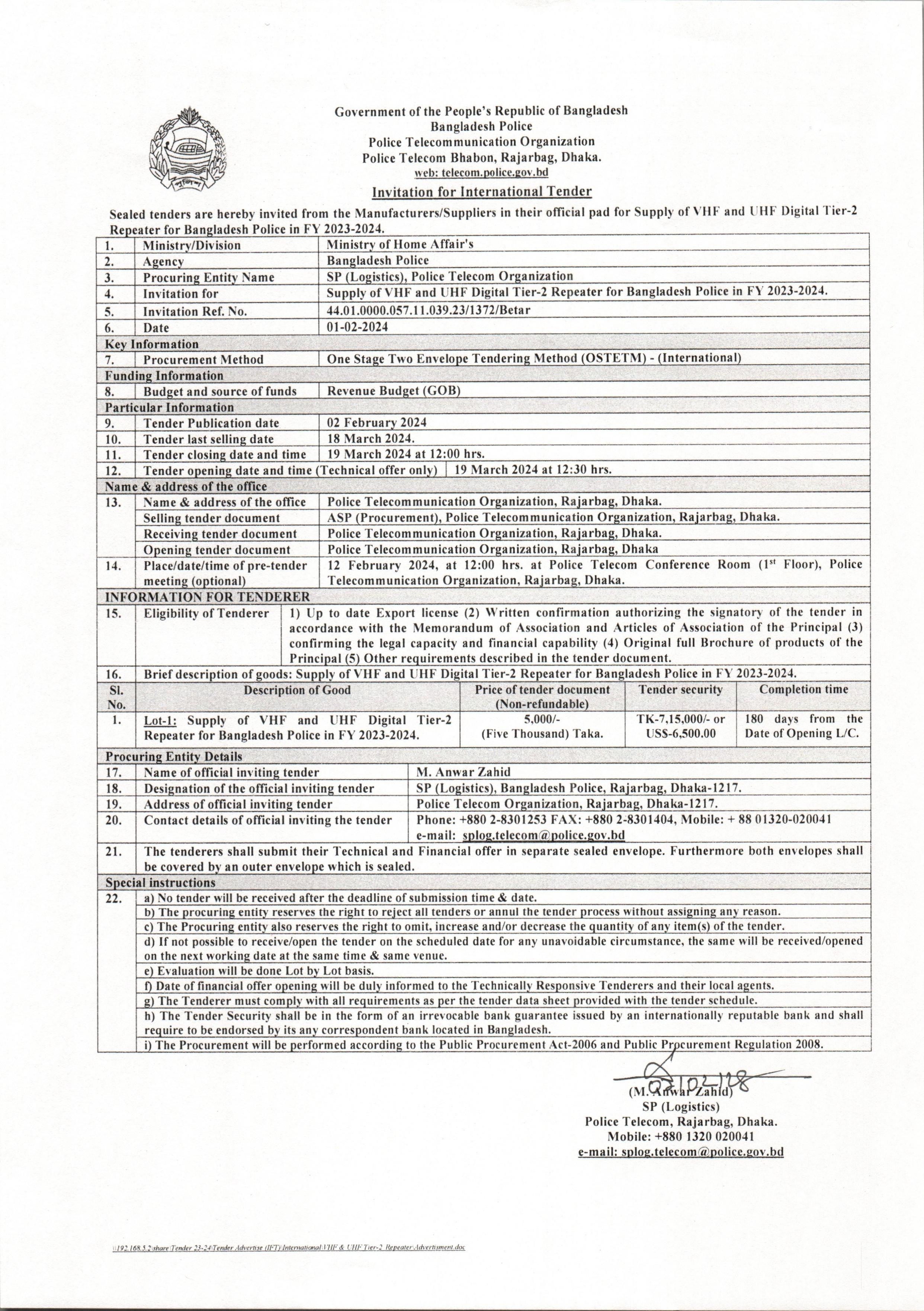 Supply , of VHF and UHF Digital Tier-2 Repeater for BD Police( Police Telecom, Dhaka.)