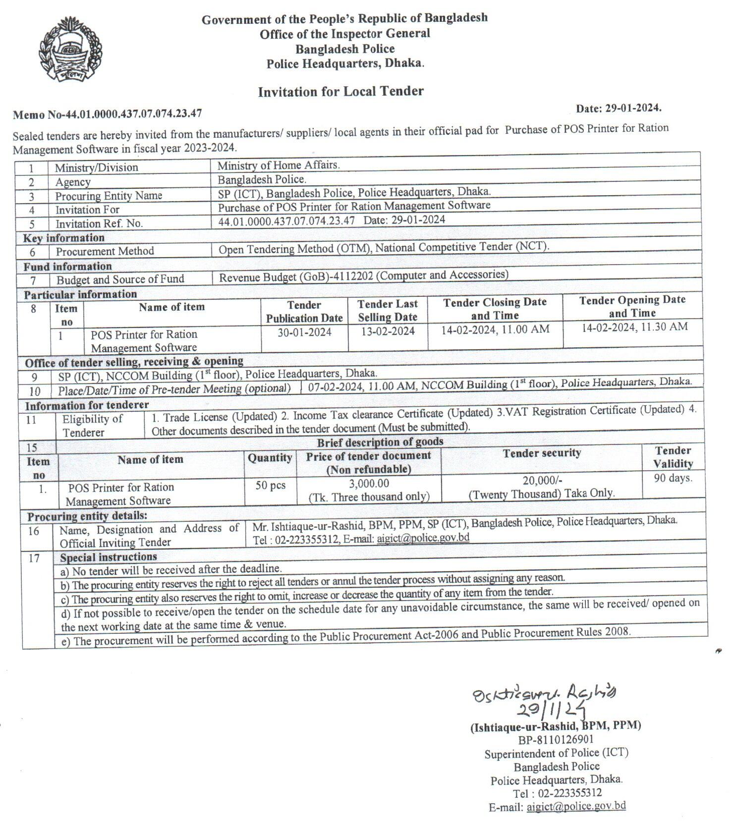 Purchase of POS Printer for Ration Management Software(ICT, PHQ, Dhaka)