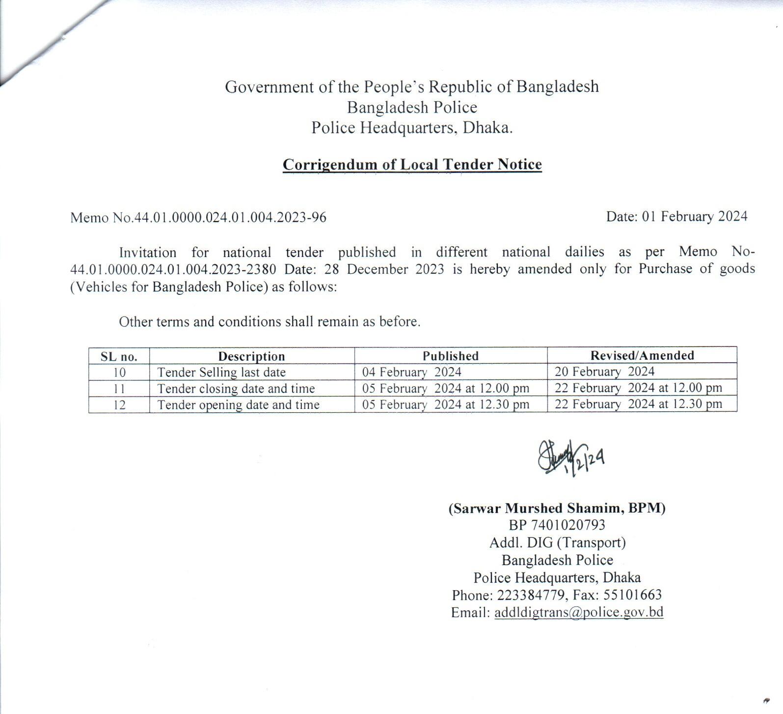 Corrigendum of Local Tender, (Transport, PHQ, Dhaka)