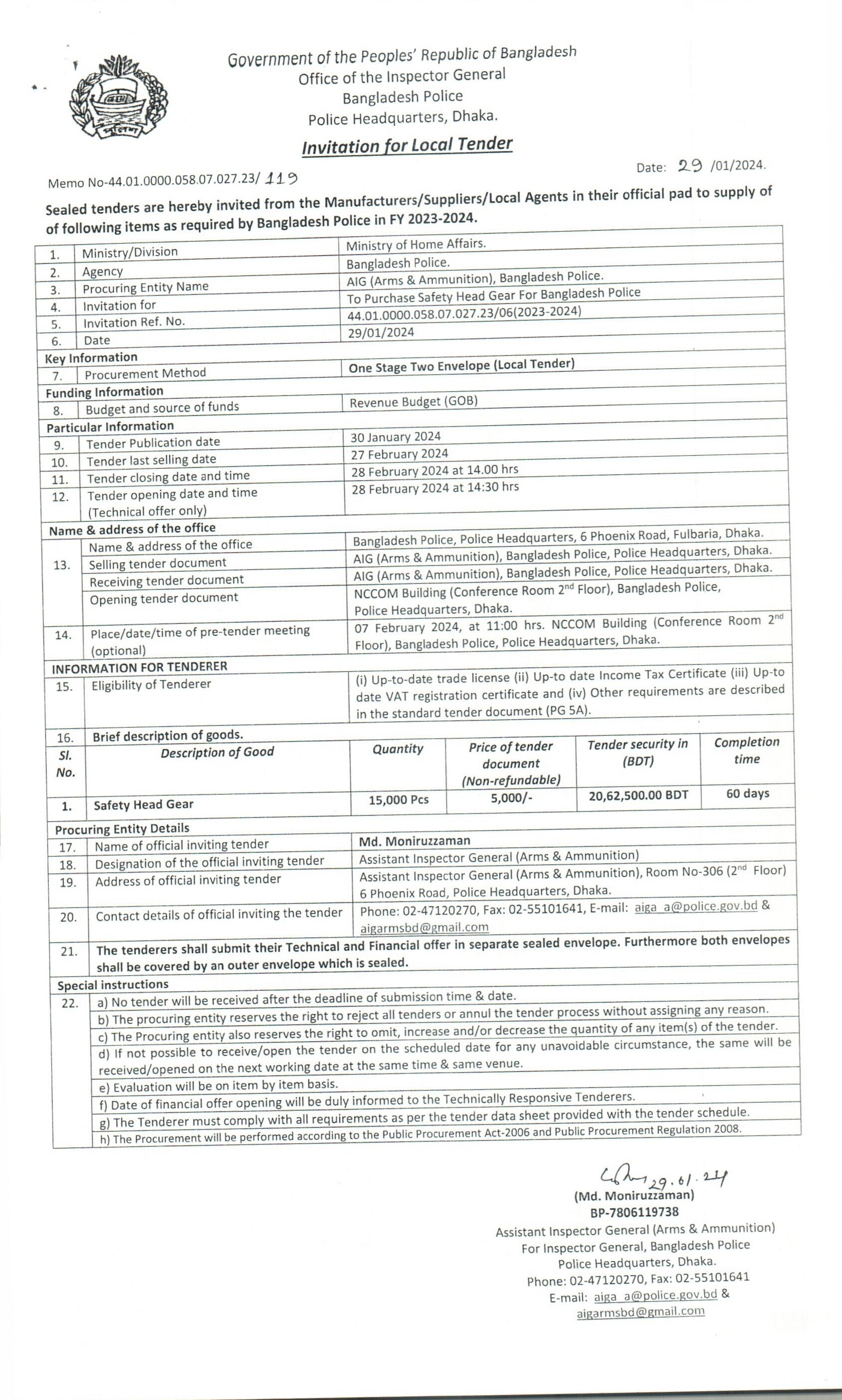 To Purchase safety Hand Gear for Bangladesh Police,( Arms & Ammunition, PHQ.)