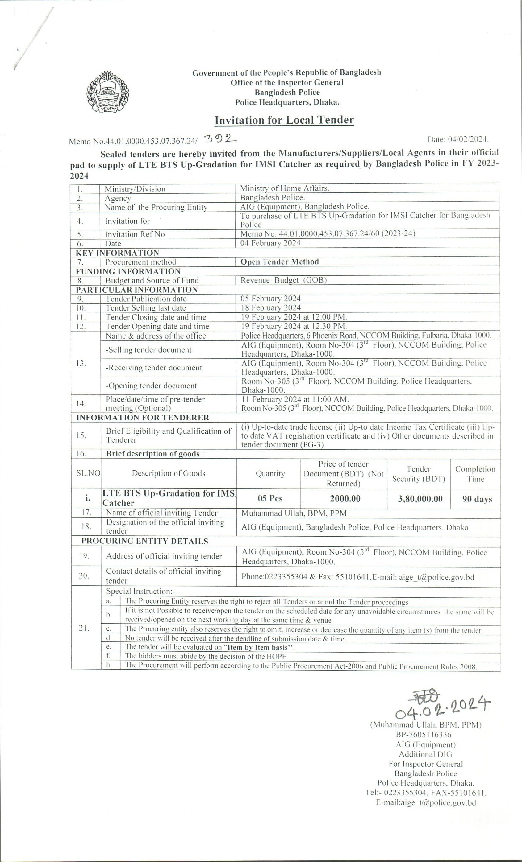 Purchase of LTE BTS Up-Gradation for IMSI Catcher for BD Police, (Equipment, PHQ, Dhaka)
