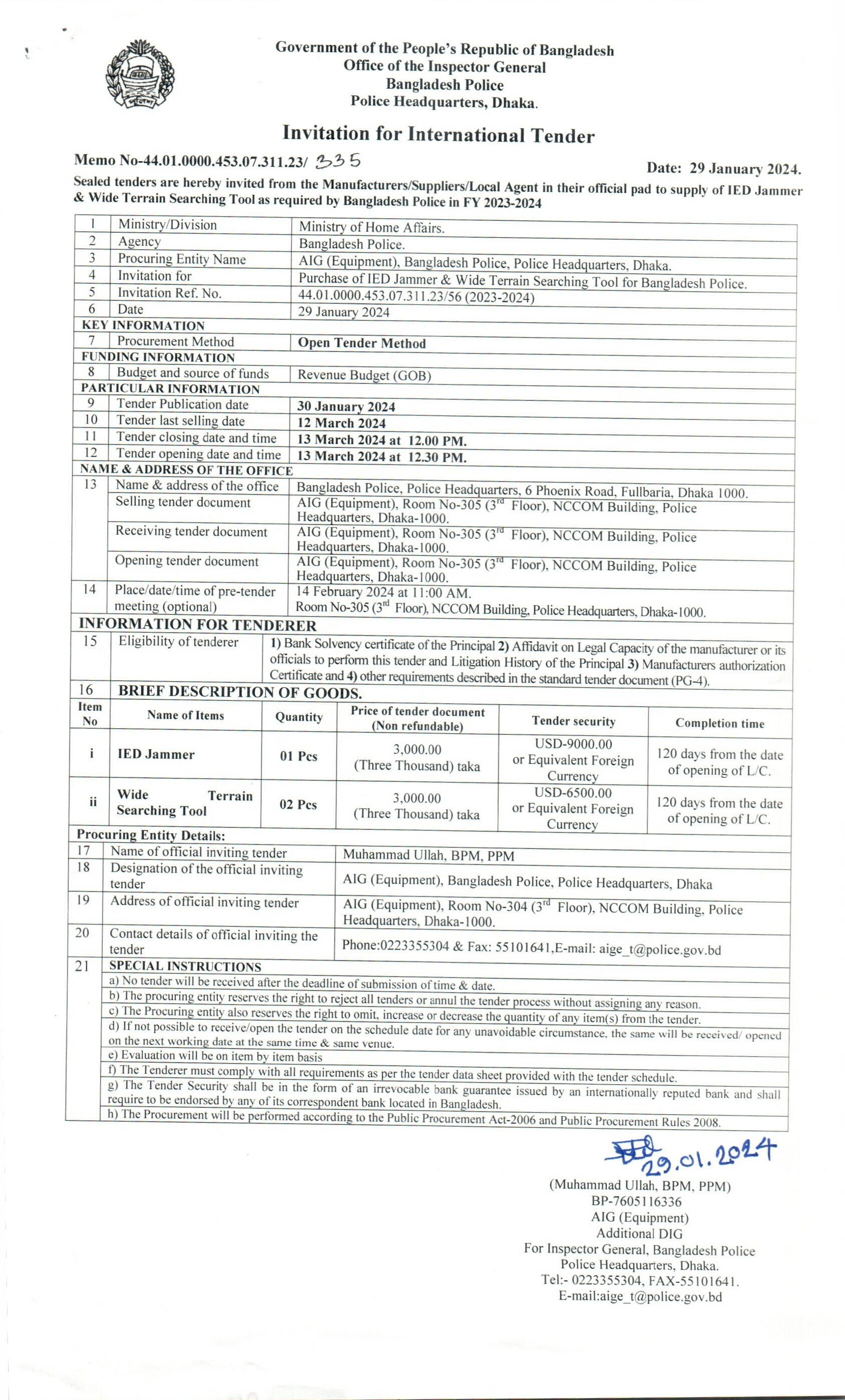 Purchase of IED Jammer & Wide Terrain Searching Tool For BD Police, (Equipment, PHQ, Dhaka)